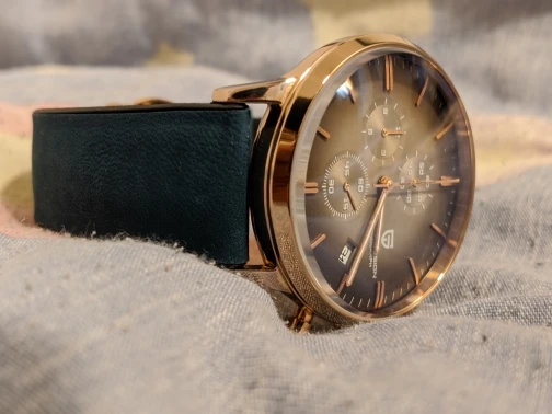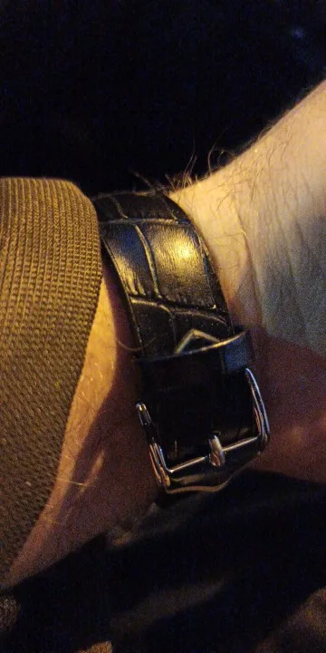 Ремешок довольно жёсткий, но думаю, что в процессе носки, станет помягче. Натуральная кожа, наклеена на пластиковое основание. Следов клея и запаха нет, всё очень аккуратно. Пряжка немного массивная, на мой вкус. Короткий, для женского запястья в самый раз, для мужчин может не подойти.
