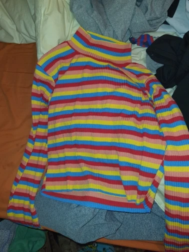 Свитер-топ достаточно яркий ,как на фотографиях,но есть минус- на краях рукавов и и всей кофты ,также швах,в первую же носку начали распускаться нити...Кофта очень понравилась,жаль ,что поношу всего пару раз..