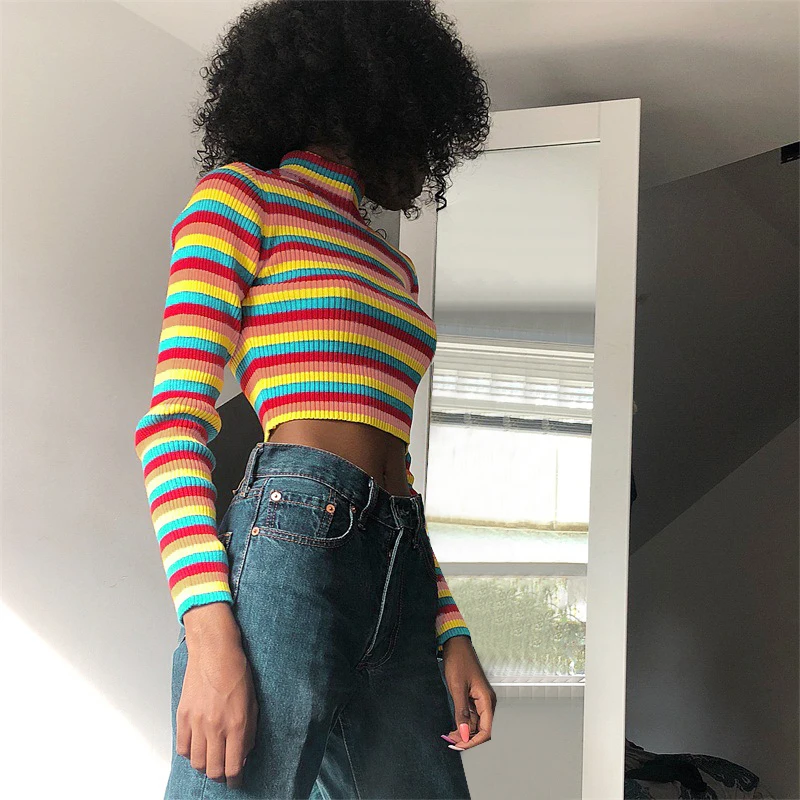 женщины свитер в радужную полоску CHRLEISURE зимние Теплый свитер Мода длинным рукавом полосками свитер