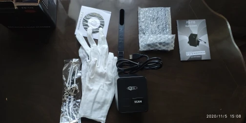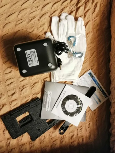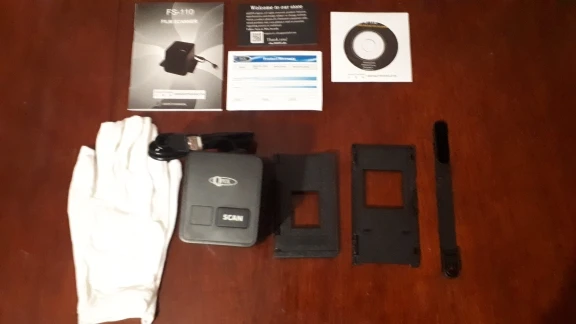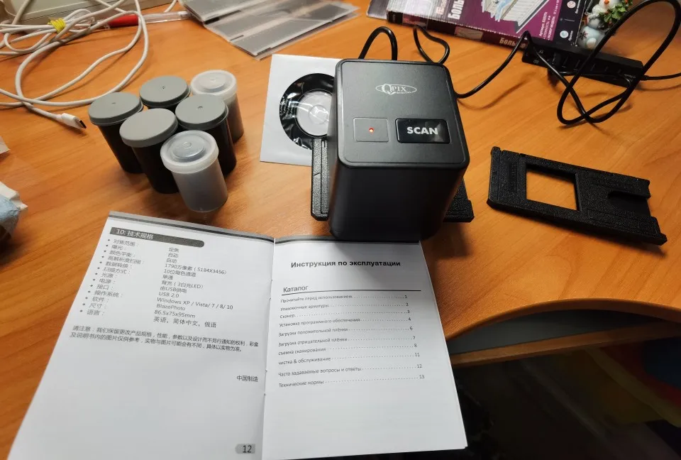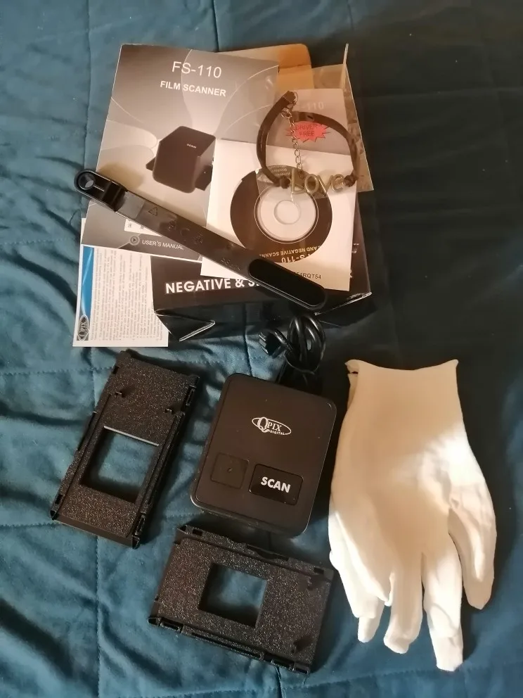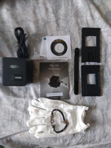 Сканер дошёл за три недели из Эстонии. С продавцом не общались. В комплекте: сам сканер с usb-проводом, две рамки для плёнки, чистилка для плёнки с бархатной наклейкой, инструкция на русском, английском и китайском, гарантийный талон, диск с мостом, перчатки и браслетик (видно в подарок).