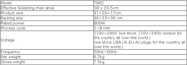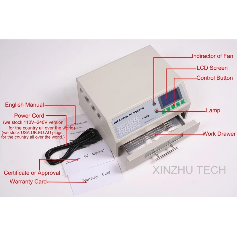 * Инфракрасный Обогреватель T962 представляет собой микропроцессор печь для оплавления, работает автоматически по кругу проложен микро-Компьютерное управление. Устройство работает от стандартных 110V ~ 240VAC 50/60 Гц. Пользовательский интерфейс реализован с помощью входных клавиш T962 и ЖК-дисплея. Предварительно установленные режимы нагрева выбираются путем взаимодействия пользователя с прогрессом теплового цикла, наблюденным на ЖК-дисплее. Это может удовлетворить дисподобие SMDBAG пайки запрос на сборке PCB. T962 может использоваться для автоматического «повторного потока» припоя для исправления плохих стыков припоя, удаления/замены плохих компонентов и завершения небольших инженерных моделей или прототипов .. Весь процесс пайки завершится автоматически, прост в использовании, быстрое инфракрасное излучение и циркуляция ветра для тепла, поэтому температура очень точная и ровная.* Оконный ящик предназначен для удержания рабочей части. Точность теплового цикла поддерживается замкнутым циклом микрокомпьютерного управления с инфракрасными нагревателями, термопарой и циркуляционным воздухом. T962 прост в использовании, процесс пайки полностью автоматический, определяется предварительно заданными тепловыми циклами.* Слабый уровень контролирует технику и может видеть верстак типа ящика, сделать весь процесс пайки у вас под наблюдением автоматически завершено; Может паять самую умную маленькую часть. Благодаря высокому и надежному дизайну вы будете довольны и уверены.