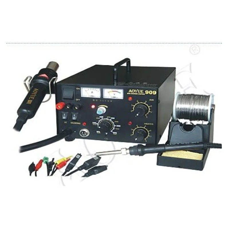 909 станция с пистолетом горячего воздуха, воздушными насадками (1124,1130,1196,1197), B003 паяльником, 2630 держатель паяльника, Z003 держатель пистолета горячего воздуха, 939 Вакуумная присоска, 10013 DC соединительные провода, шнур питания.