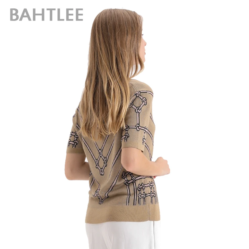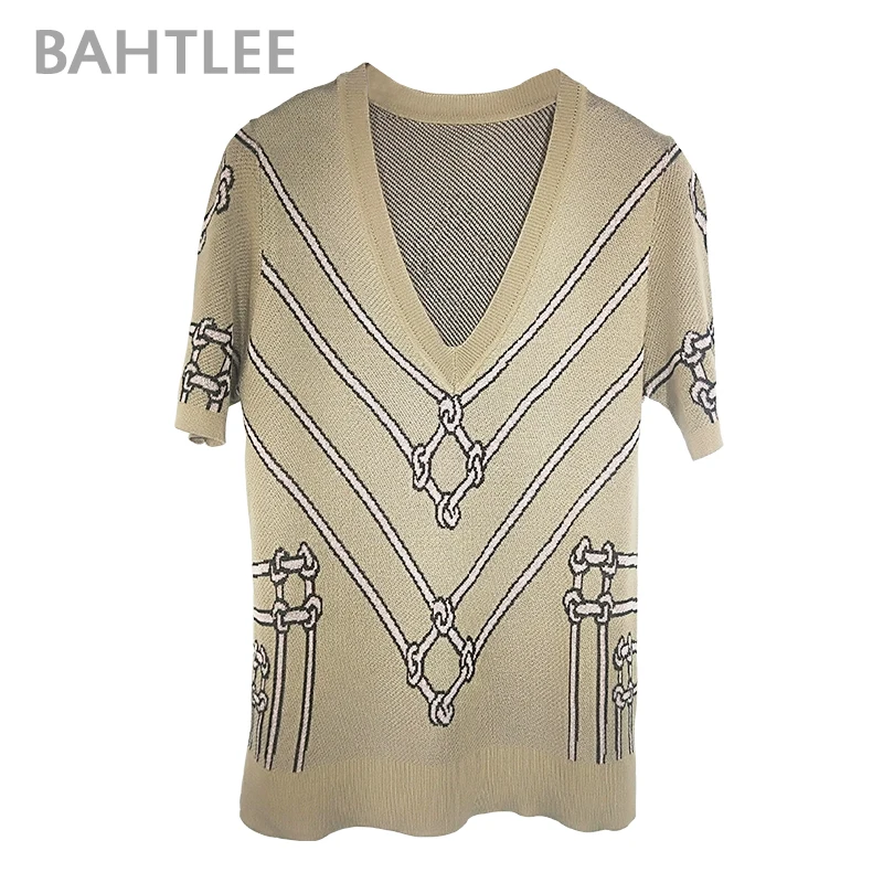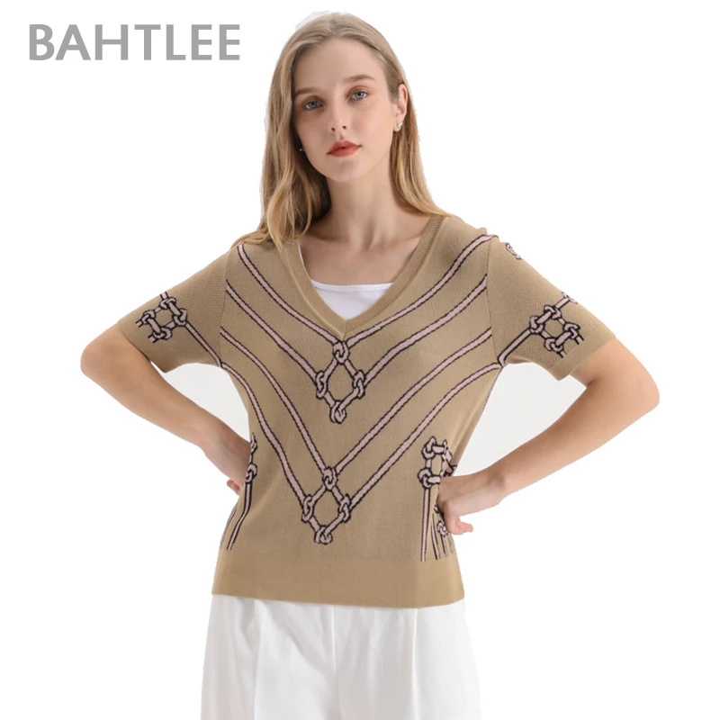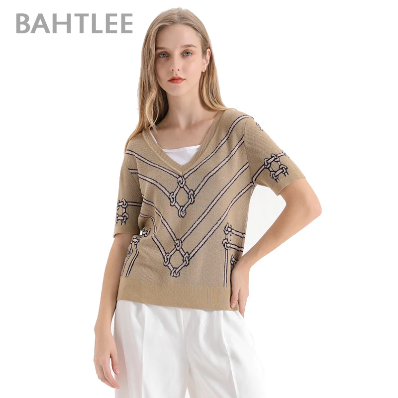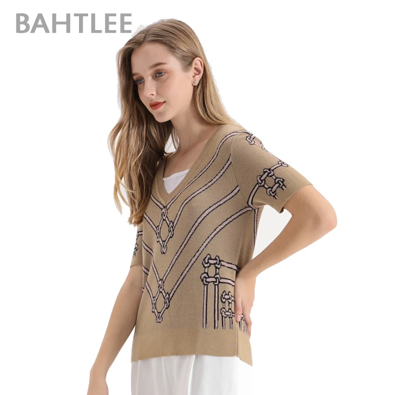 Женский вязаный свитер BAHTLEE, с V-образным вырезом, коротким рукавом, жаккардовый, с вентиляцией, свободного покроя, летний