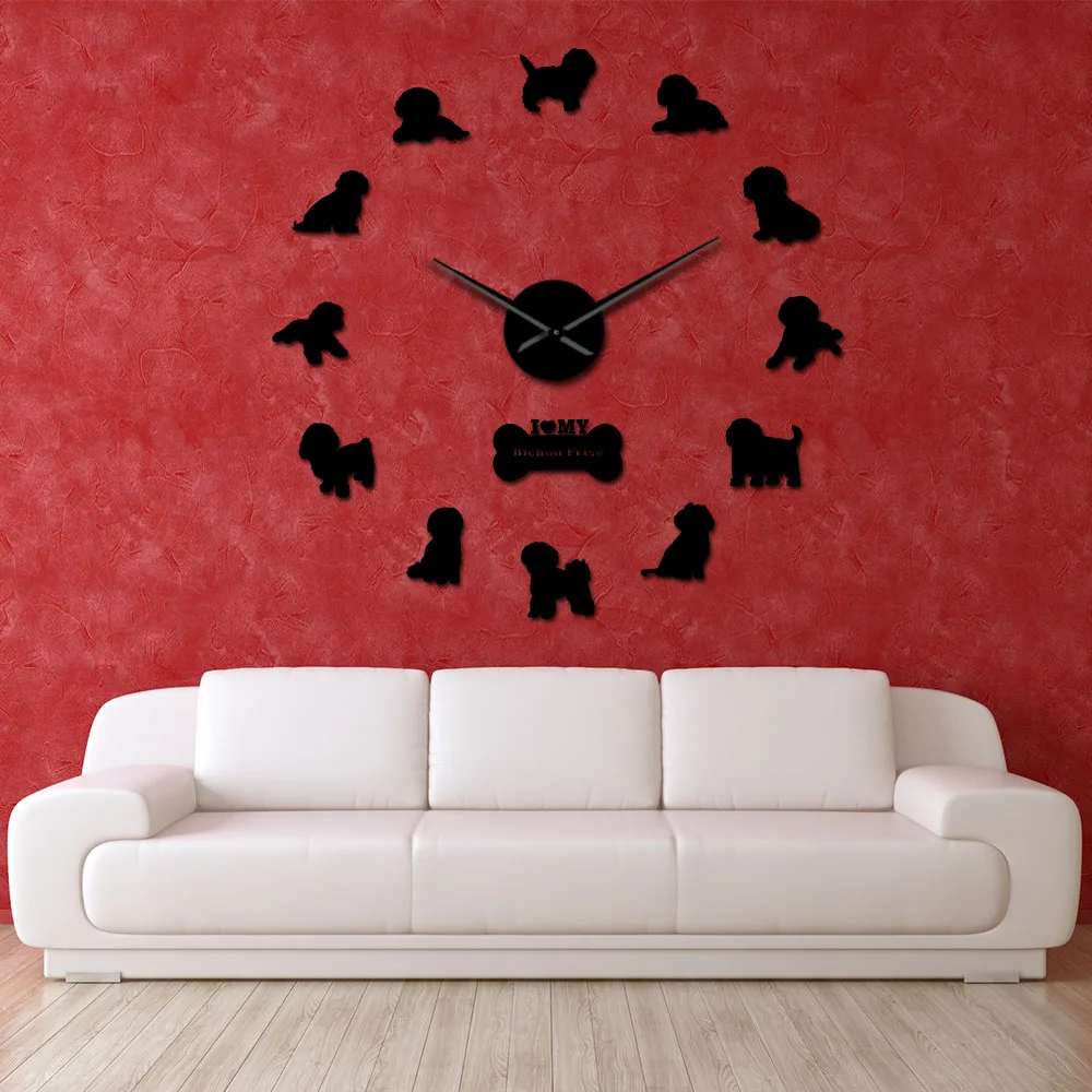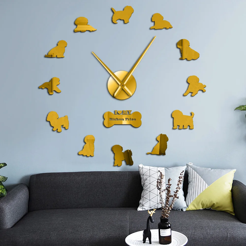 Большие настенные 3d-часы Bichon Frise с зеркальным эффектом, бесшумные часы с функцией движения на тенерихе, настенные часы