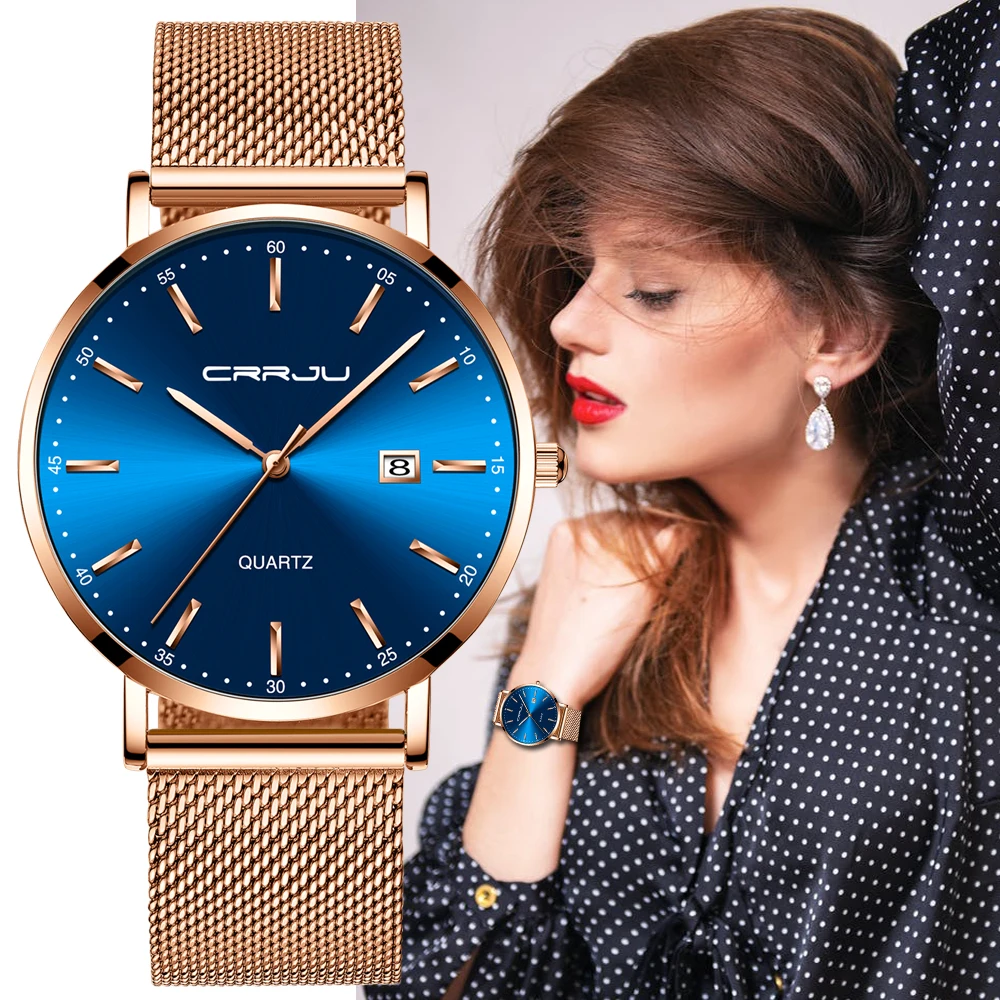 CRRJU, женские часы, Топ бренд, роскошные женские часы с сетчатым ремешком, ультра-тонкие часы из нержавеющей стали, водонепроницаемые часы, кварцевые часы, Reloj Mujer