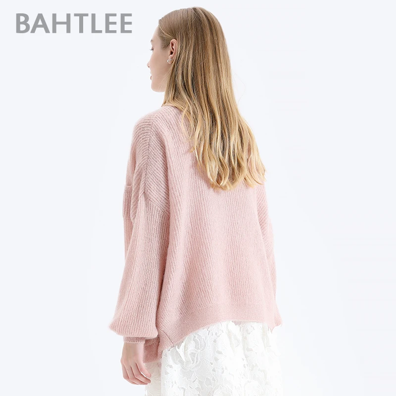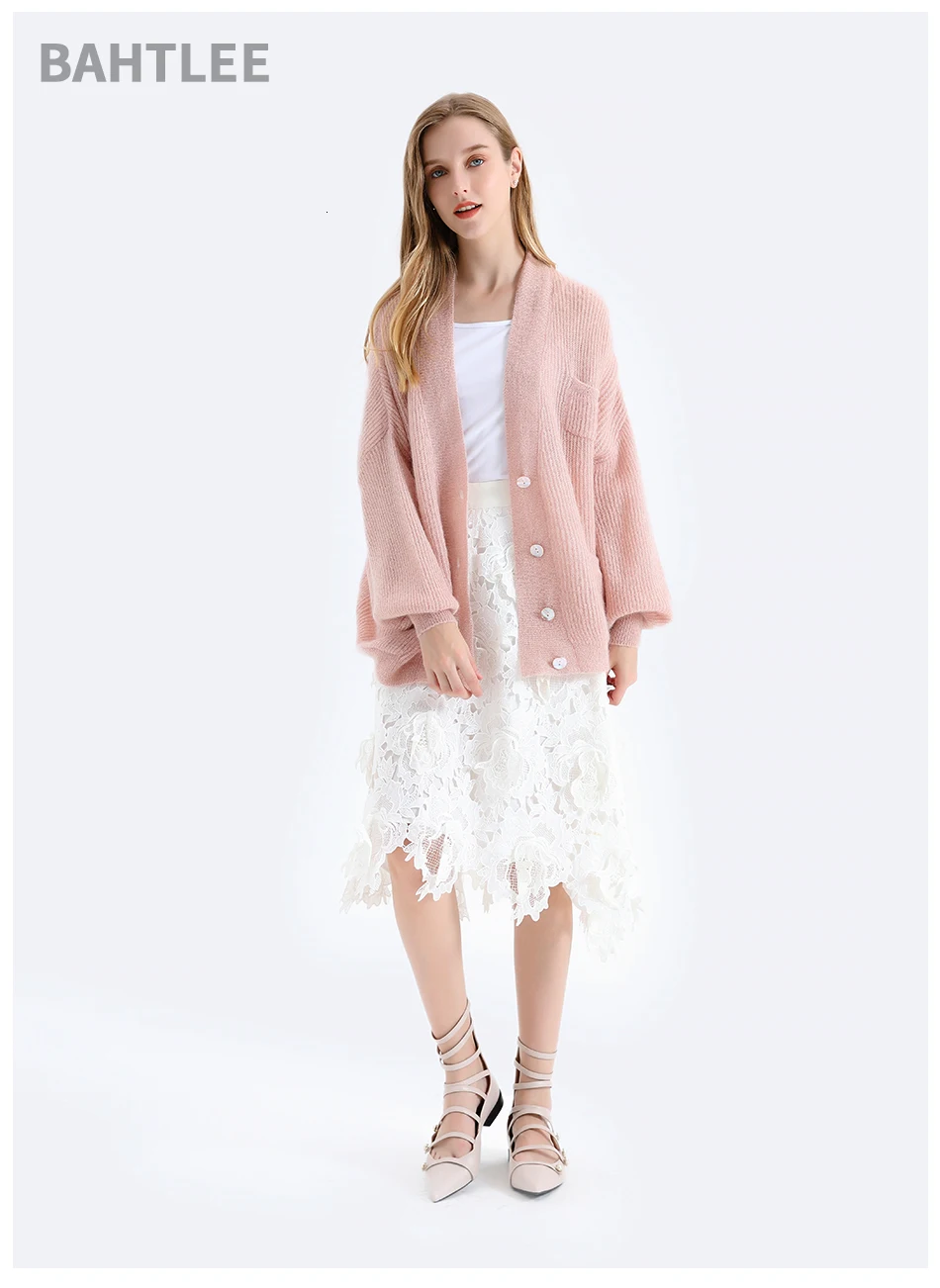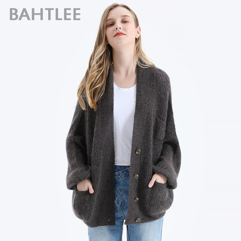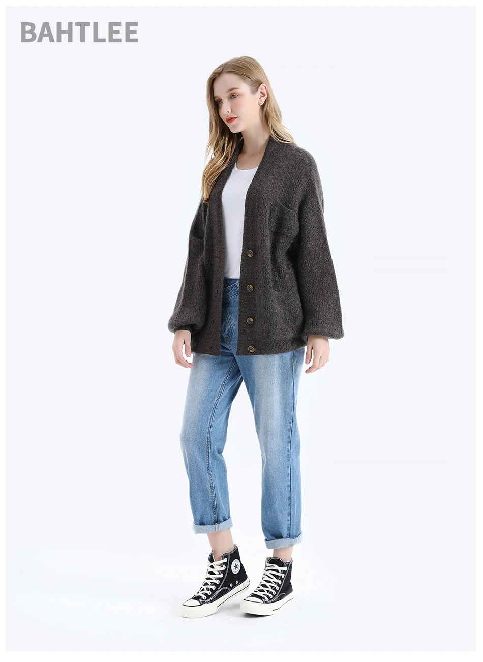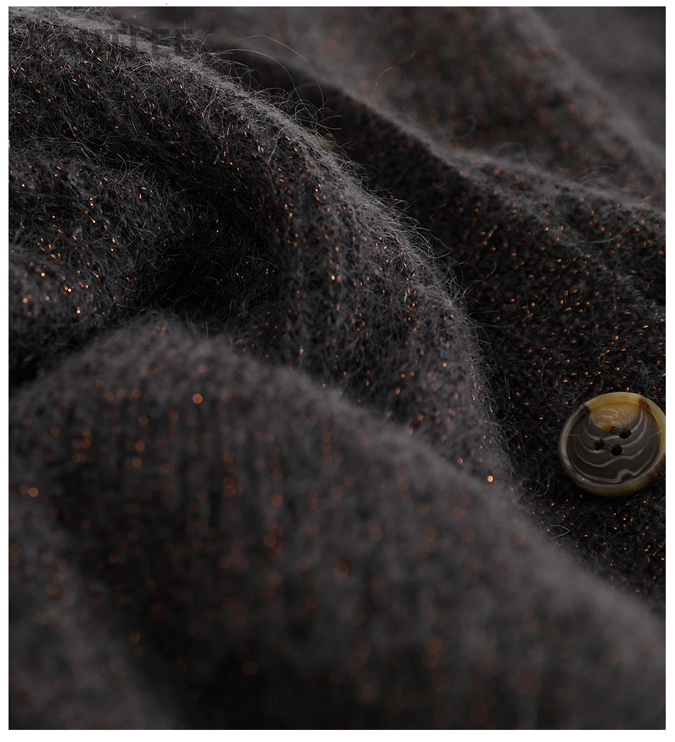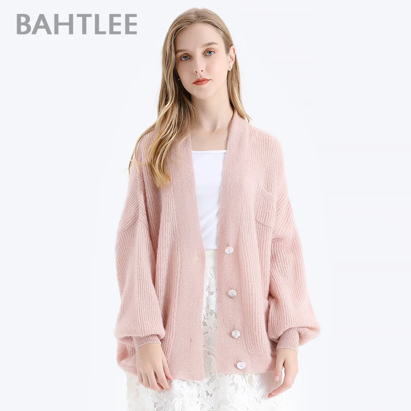 Женский мохеровый свитер BAHTLEE, вязаный джемпер с золотистым люрексом и пышными рукавами, Свободный кардиган с V-образным вырезом на пуговицах на осень и зиму