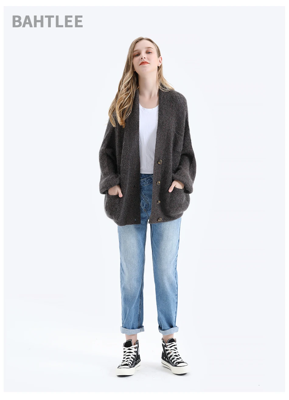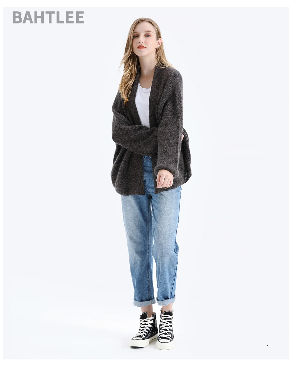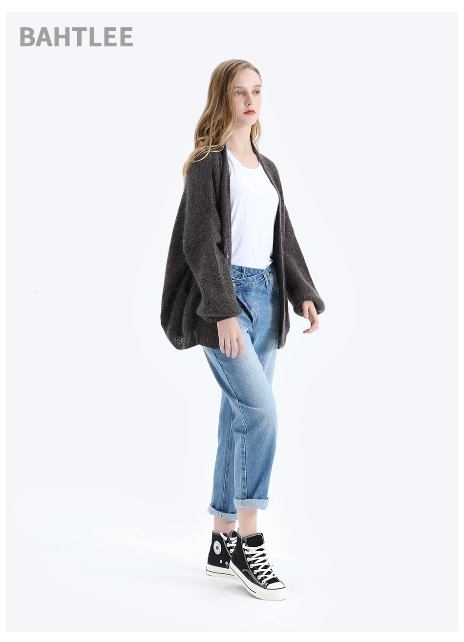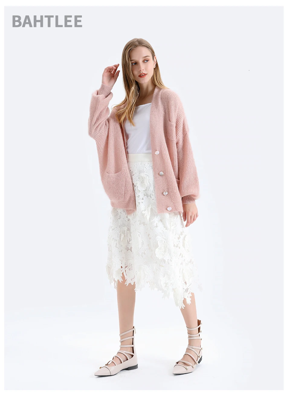 Женский мохеровый свитер BAHTLEE, вязаный джемпер с золотистым люрексом и пышными рукавами, Свободный кардиган с V-образным вырезом на пуговицах на осень и зиму