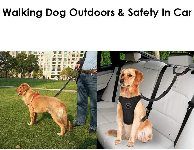 Хорошо сделано и идеальные детали--- Запираемая БЫСТРОРАЗЪЕМНАЯ Пряжка этого ремня безопасности прочная, а фурнитура металлическая, в то время как ремни изготовлены из прочного нейлона. Светоотражающая строчка отлично подходит для использования в ночное время. Эластичный банджи помогает собаке предотвратить рывки при резком движении.