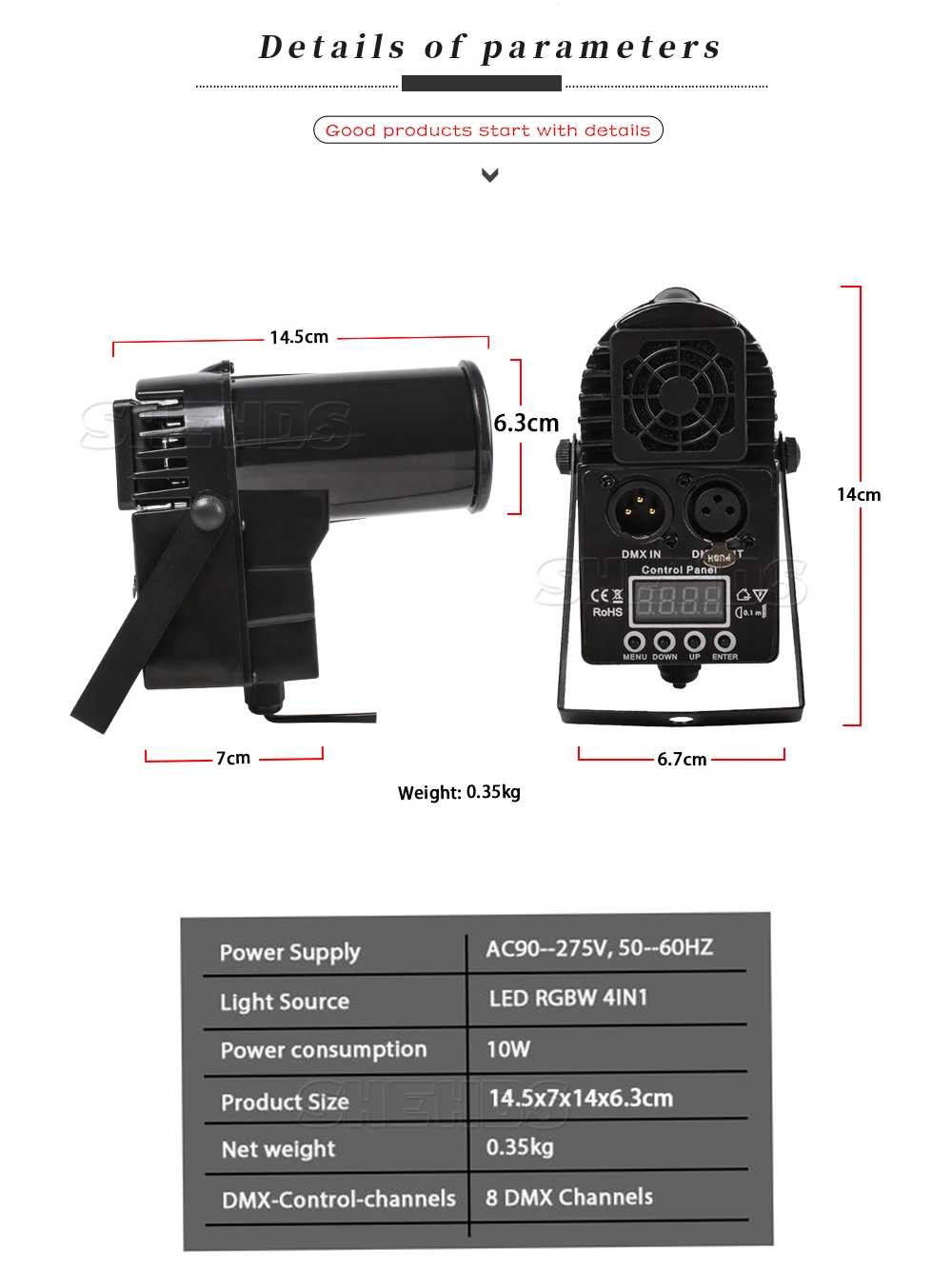 1. Название продукта: светодиодный прожектор2. Размер изделия: 7*14,2*13 см3. Светильник источник: импортная кри-10 Вт светодиоды4. Напряжение: AC90-240V,50-60 Гц5. Потребляемая мощность: 10 Вт6. Характеристика: высокая яркость и низкое потребление7. Применение: дом, комната KTV, танцевальный зал, небольшая производительность и т. д.8. Размер посылка: 16*16,2*9 см9. Режим работы: DMX 512 ,4/8 канал, мастер/раб, автономный, автоматический запуск, активация звука10. Вес нетто/вес брутто: 0,35/0,45 кг