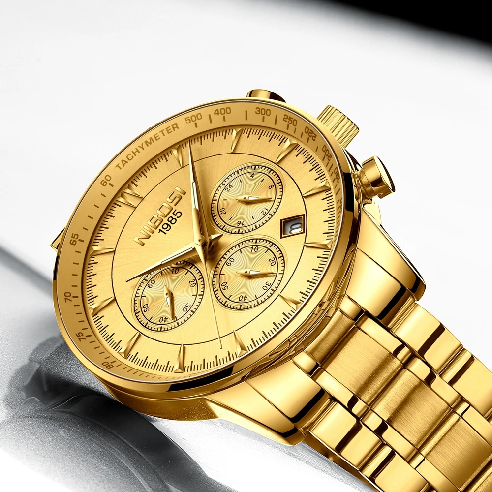 Часы наручные NIBOSI мужские золотистые, брендовые Роскошные спорти...
