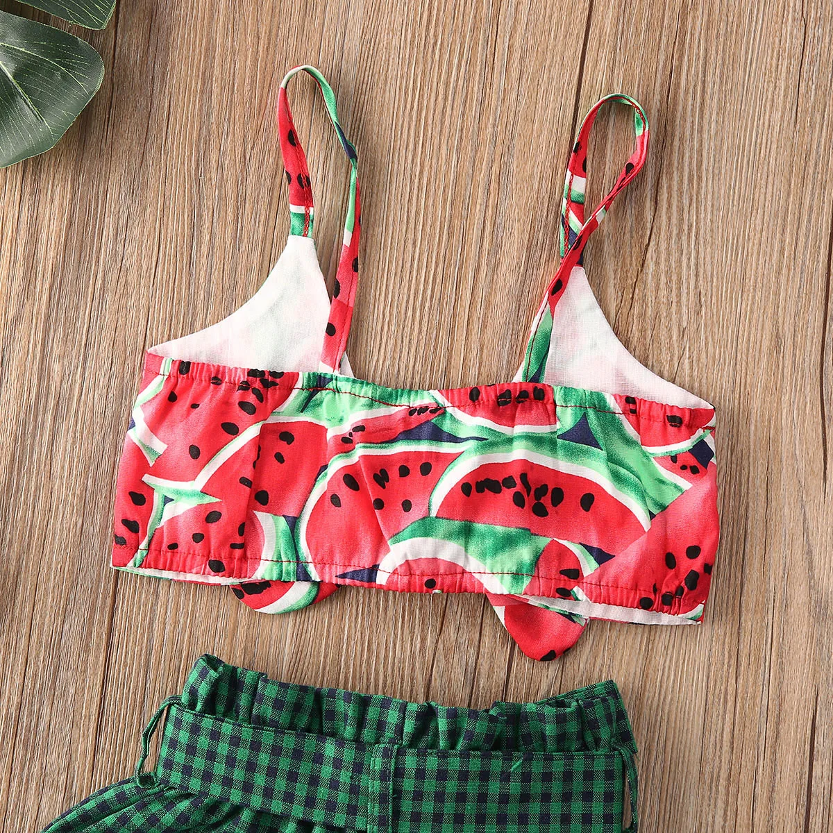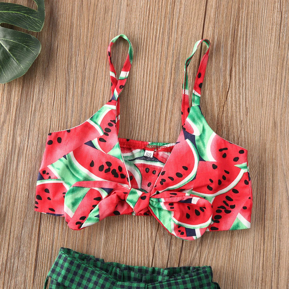 EmmababyЛетняя одежда для маленьких девочек; Жилет с бантом и арбузом; Укороченный топ; Рубашка + шорты в клетку