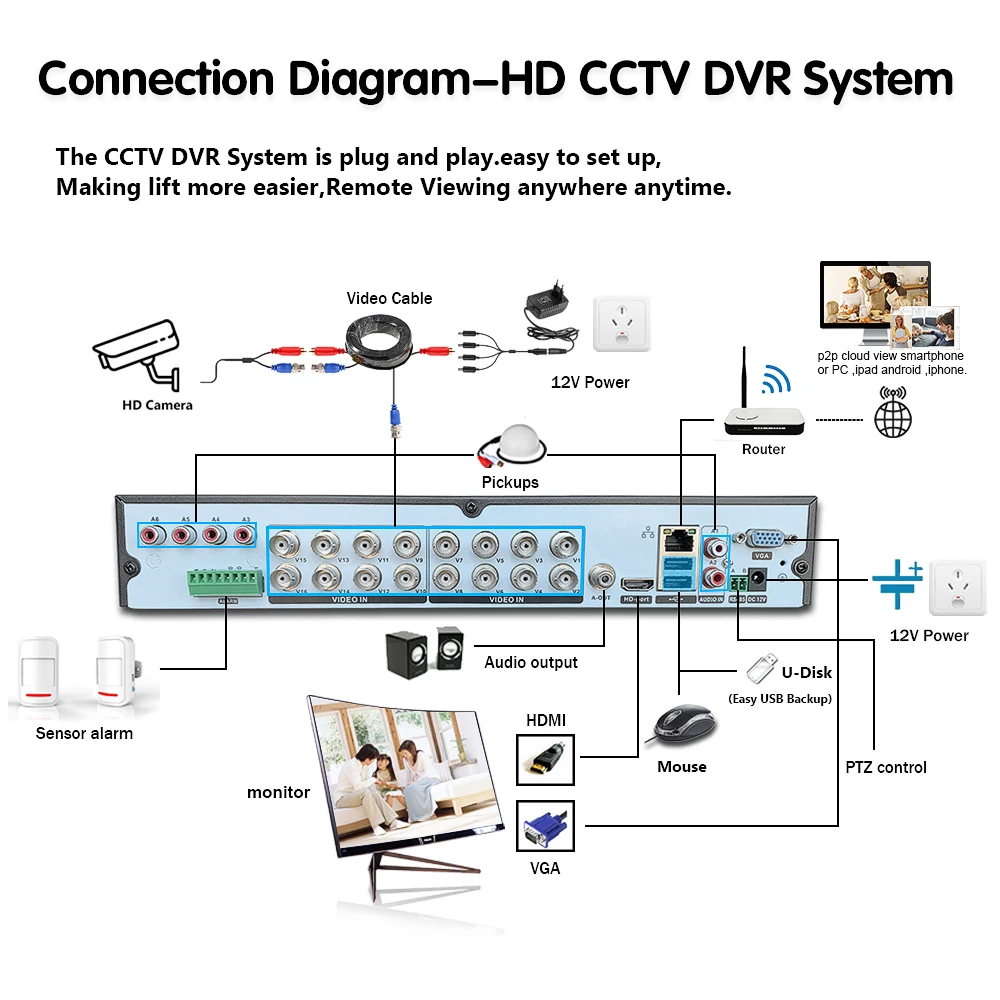 Простая настройка, всего 4 шага для просмотра мобильный телефон, просмотра видео в режиме реального времени из любого места и в любое время с помощью смартфона, стола или ПК с передовой технологией P2P, вы можете получить удаленный доступ к вашей системе за считанные минуты или меньше, нет необходимости в переадресации, удаленный доступ никогда не был таким простым!