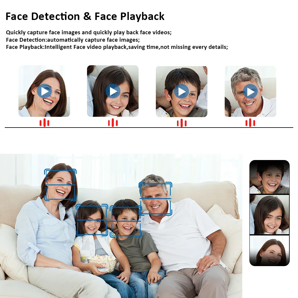 Обнаружение лица, воспроизведение лица и запись лица;Быстро снимает изображения лица и быстро воспроизводит видео лица;Обнаружение лица: автоматическое снятие изображений лица;Воспроизведение лица: интеллектуальное воспроизведение видео, экономия времени, не пропуская все детали.