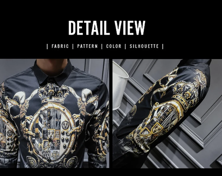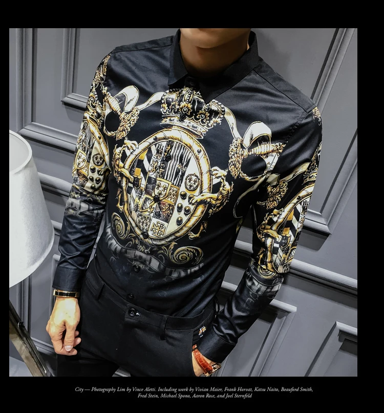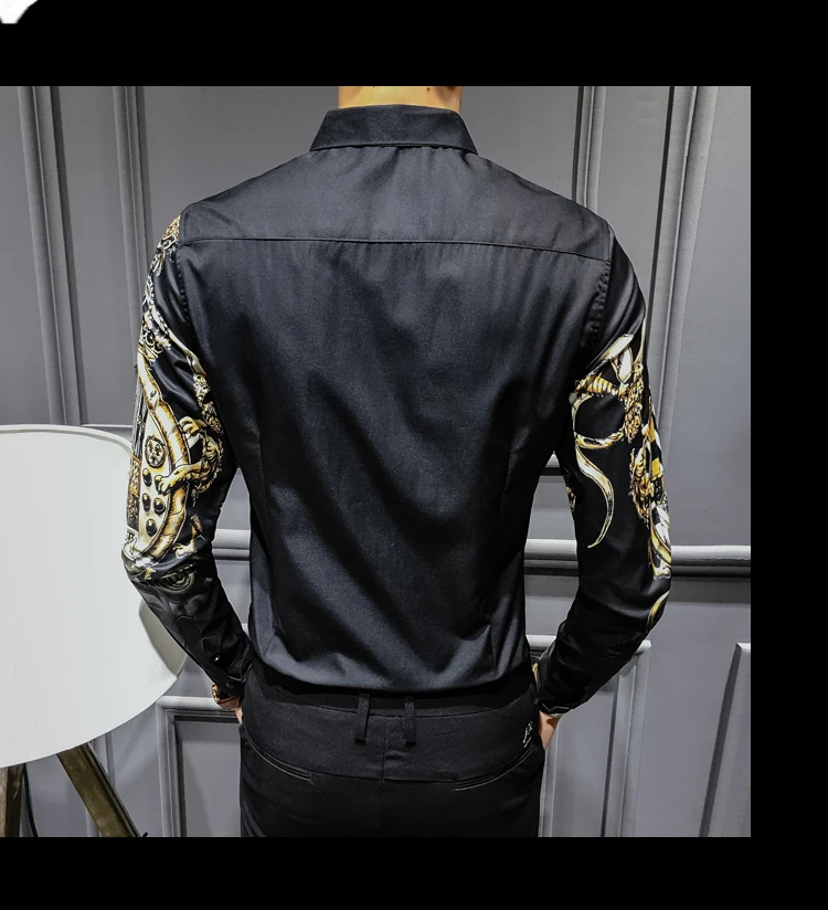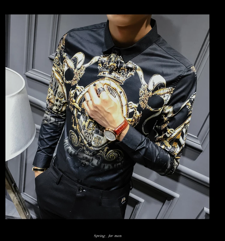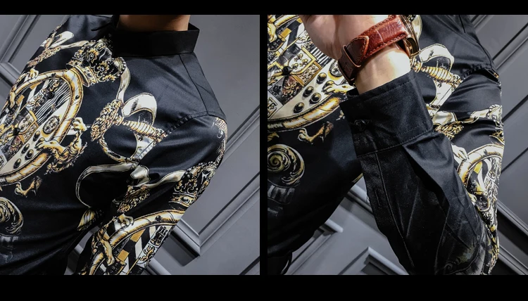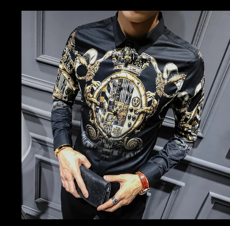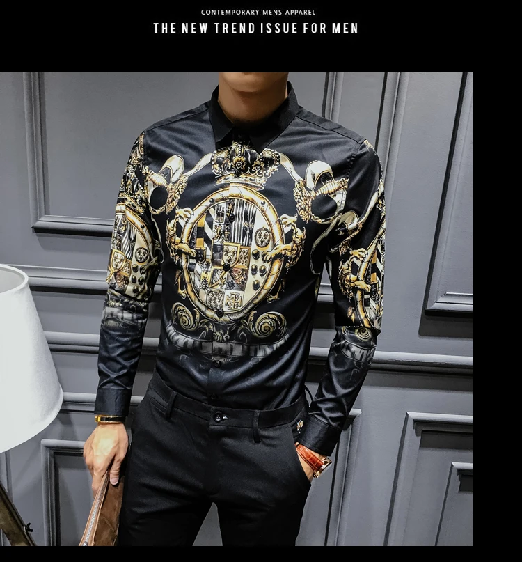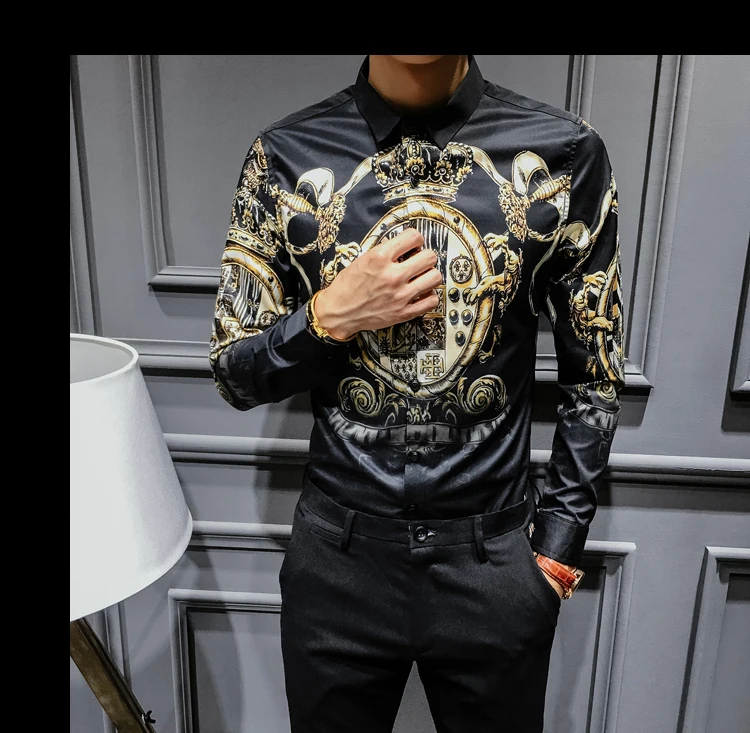 Мужская рубашка с длинным рукавом Camisa Homem, черная Облегающая рубашка золотого цвета с принтом, вечерние Клубные рубашки большого размера 4xl, 2019
