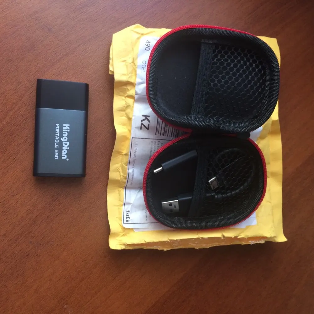 Очень компактный, в отдельной коробочке для переноса. В комплекте коротенький УСБ - УСБц провод и переходник. Андроид определил, предложил отформатировать. диск завёлся. К моей ВИН10 подключается с не охотой. Доставка - быстрая!
