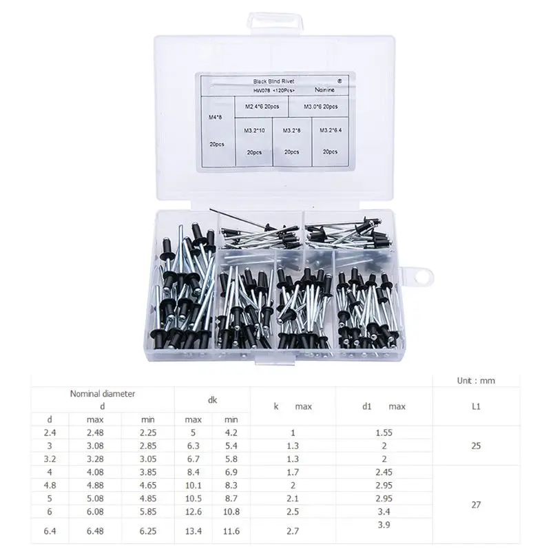 Черные алюминиевые заклепки 120 шт.компл. M2.4 M3.0 M3.2 M4, декоративные заклепки для ногтей, набор для мебели в ассортименте