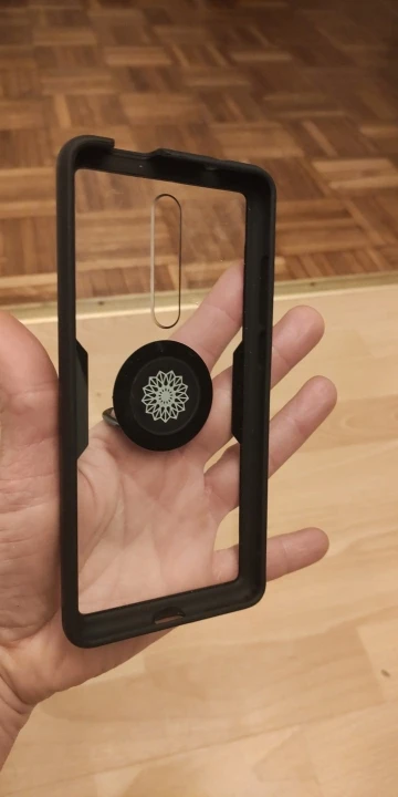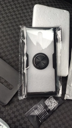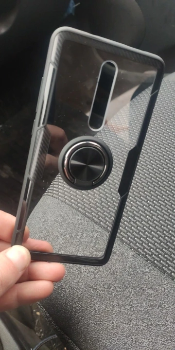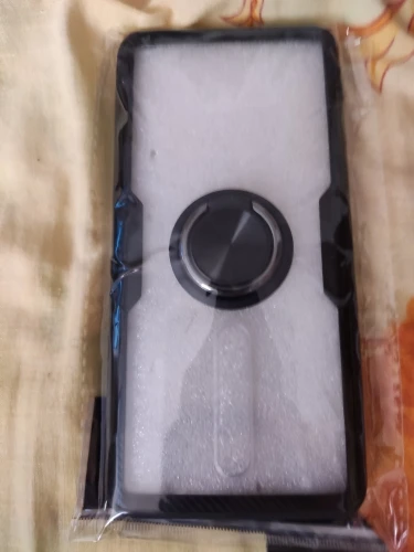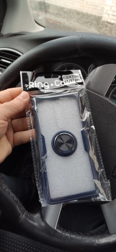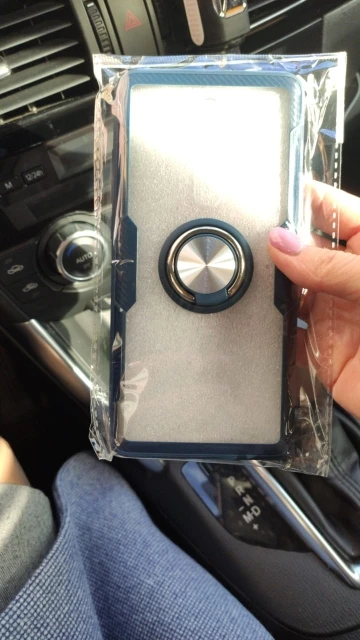 Чехол выглядит как в описании, только центральная часть кольца стала пластиковой. Не уверен что будет держаться магнитным автодержателем. Сидит отлично, бортики выше экрана, закрывают защитное стекло.