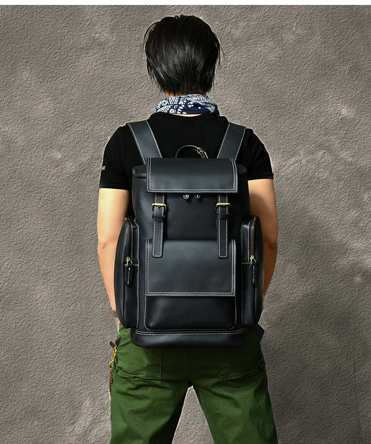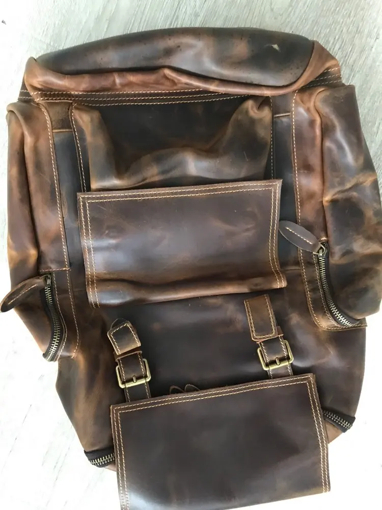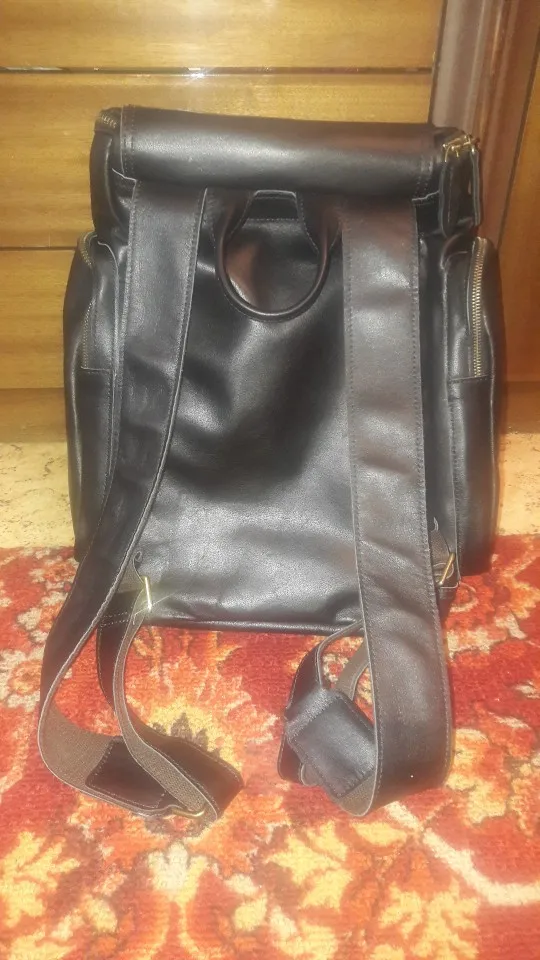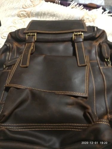 В общем рюкзак выглядит очень даже достойно, кожа натуральная толстая, запах кожи начал чувствоваться ещё в упаковке, при Всем этом есть серьезные недостатки, на лицевом кармане очень криво прикреплены магниты, в связи с чем чтобы закрыть его надо постараться и при закрытых магнитах становится видно перекошеный карман. Кожа на предлагаемом фото чёрного цвета выглядит как глянцевая, по факту она матовая и все потёртости видно также как и на коричневой. Если не брать во внимание криво установленный магнитный замо кармана, то конечно товар хороший, доставка отслеживается и пришёл быстро и в срок
