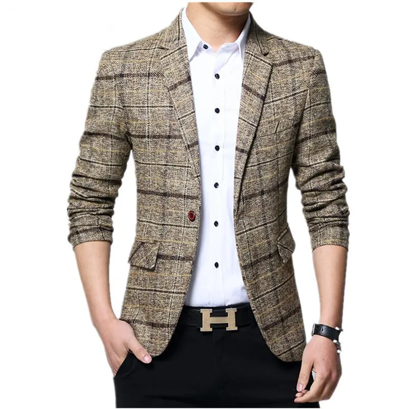Мужской пиджак, новинка 2019, брендовая одежда, куртка, мужской клетчатый шерстяной костюм, куртка, Модный деловой облегающий мужской повседневный блейзер