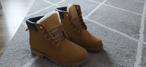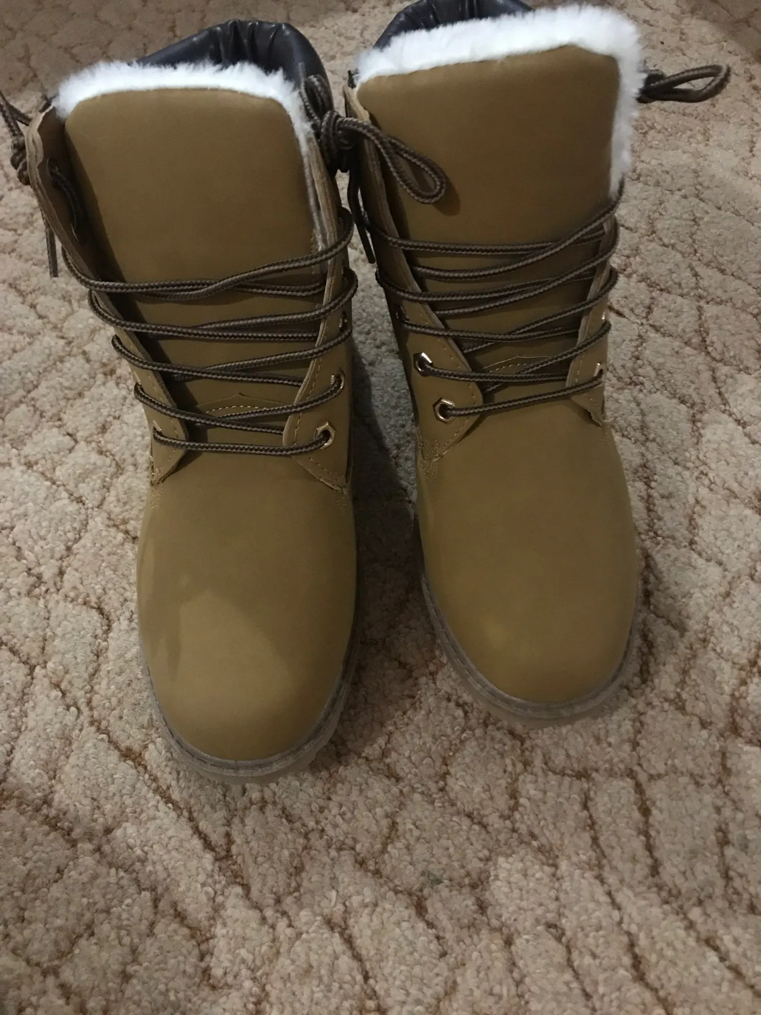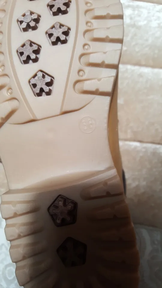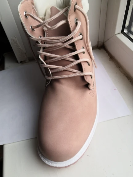 В целом, довольна покупкой. Ботинки легкие, мех приклеен хорошо, не сыпется. На подошве пластиковые вставки-звездочки, на пятке чуть выше, чем остальные, видимо, от гололедицы. Швы сделаны хорошо, только в двух местах торчат нитки и двойная строчка. На свой размер 39.5-40 взяла размер 9.5, на подошве пугающая цифра 42. Сели хорошо, немного сводобно на хб носок. Зимой, с толстым или шерстяным, будет самое то. Подойдут для широкой стопы. Про материал верха сказать пока ничего не могу. На ощупь как нубук, но это не он. Взяла на сезон, чтобы не жалко было "убить" их. Как поведут себя зимой - посмотрим. Дополню отзыв. Заказ пришел в пластиковом пакете + пупырка. С момента оплаты заказа прошло 13 дней и уже пришли на почту (Москва). То есть довольно скорая доставка. Продавец подарил резинку для волос, спасибо.