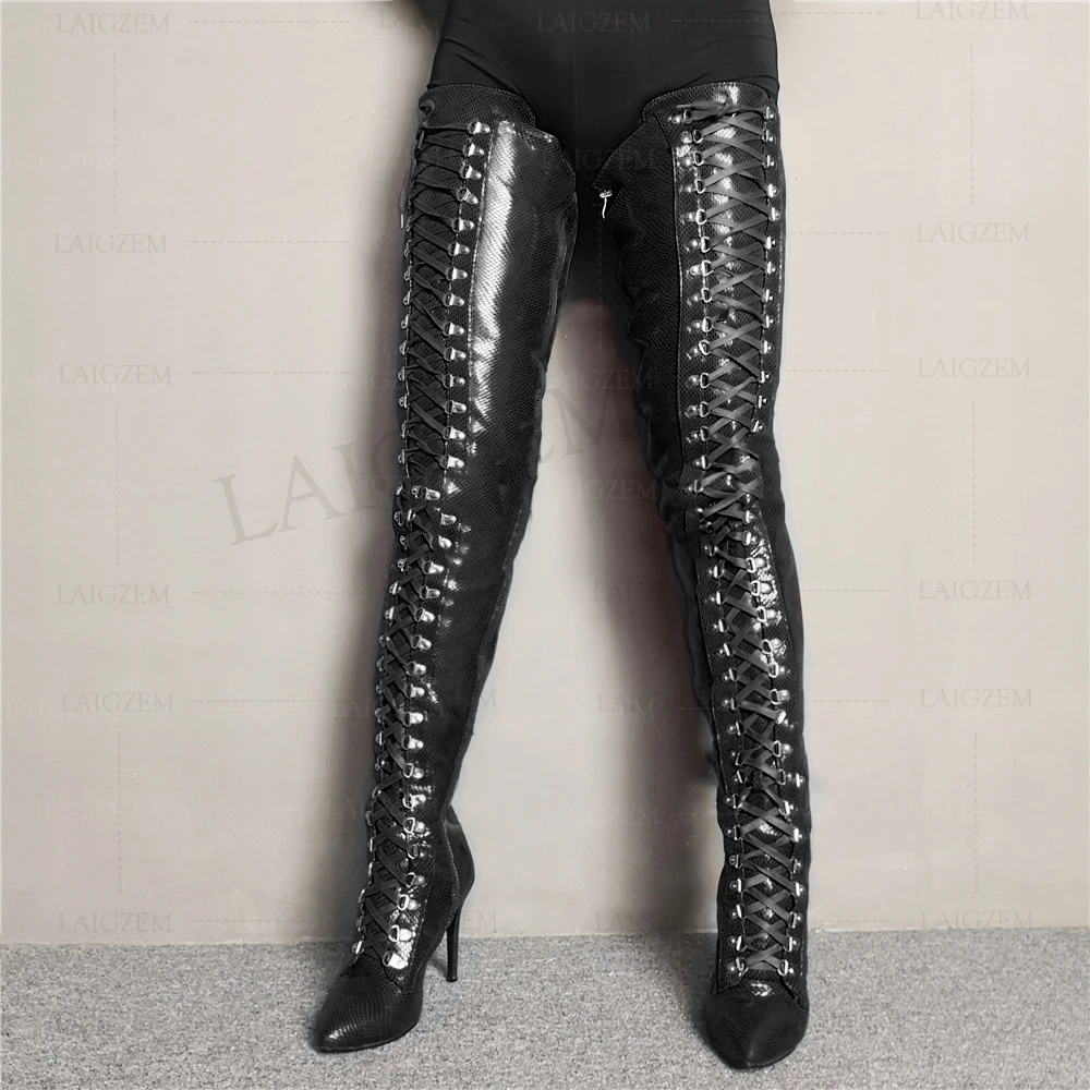 LAIGZEM/пикантные женские сапоги до бедра; Сапоги до середины икры на высоком каблуке; Сапоги до промежности со шнуровкой на шпильке; Botines Mujer; Большие размеры 4-14.