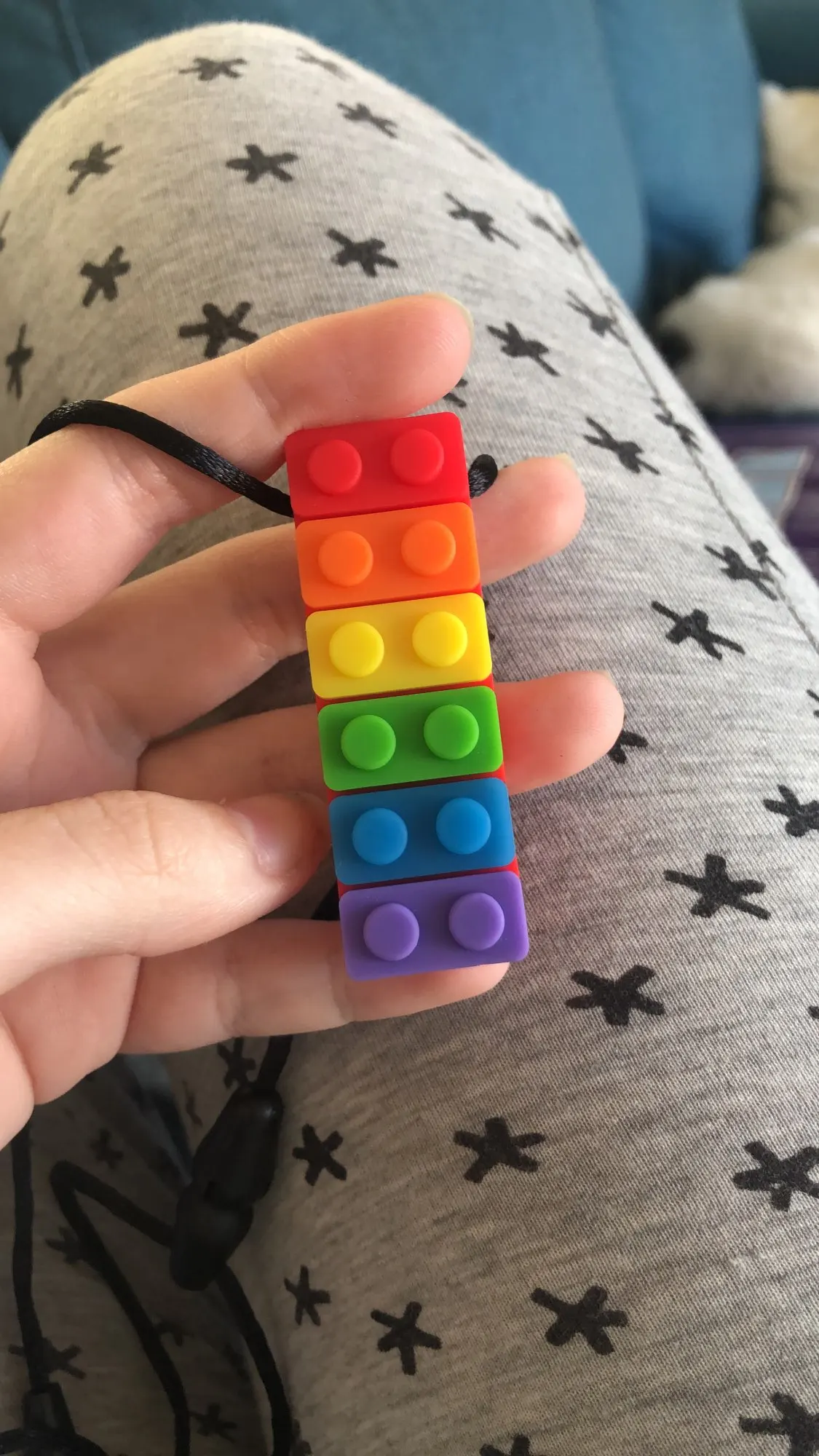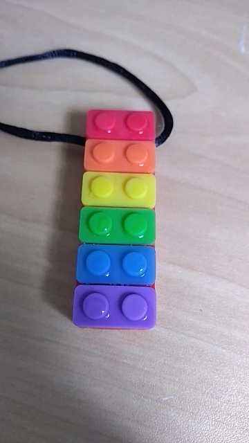 на удивление ребёнку нравится (8 месяцев). мягкая резина. носит на шее весь день. длина регулируется