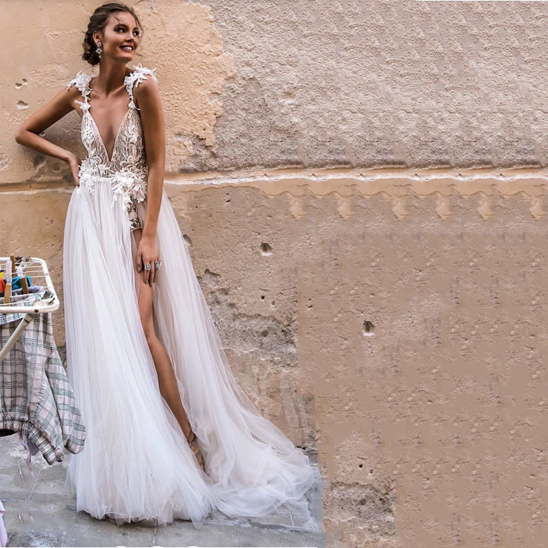 Платье Свадебное Smileven в стиле бохо, длинное кружевное ТРАПЕЦИЕВИДНОЕ, с открытой спиной, с V-образным вырезом, с кружевной аппликацией, в стиле бохо, 2019