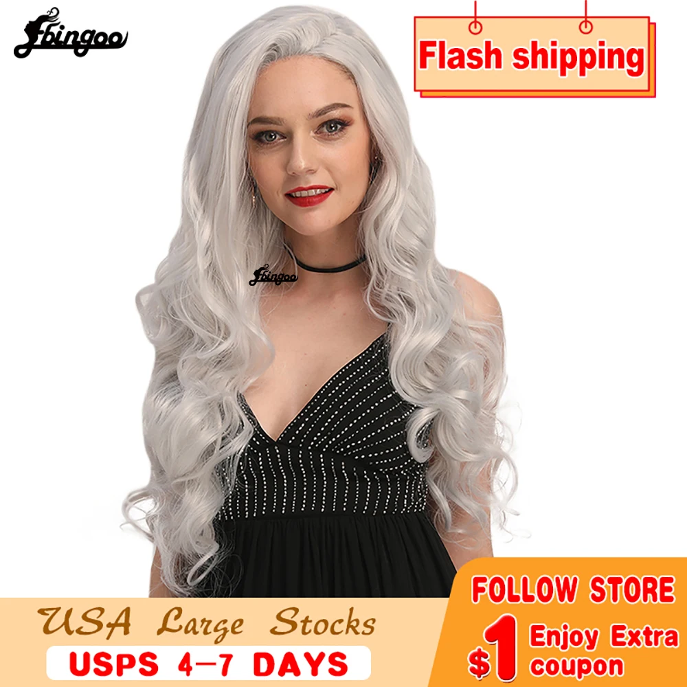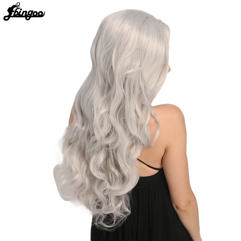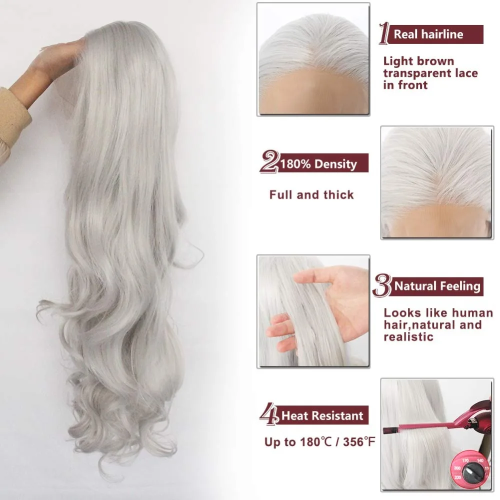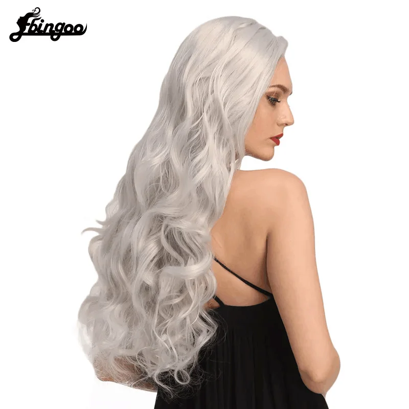 Ebingoo высокотемпературный волокнистый длинный волнистый серебристо-серый синтетический кружевной передний парик для женщин и девушек с бесплатной частью
