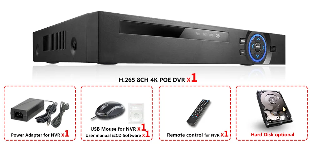 1 сетевой видеорегистратор H.265 8CH 4K POE NVR;1 x Блок питания для NVR;1 х USB мышь для NVR;1 компакт-диск программного обеспечения для NVR;1 пульт дистанционного управления для NVR;Жесткий диск опционально!