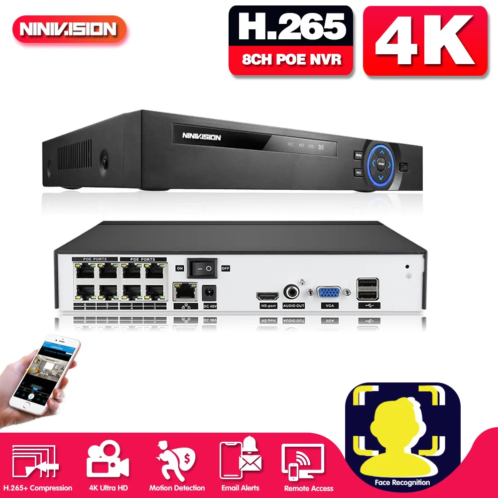Распознавание лиц H.265 4K 8MP 8CH POE NVR охранное видеонаблюдение видео рекордер распознавание лица человека и оповещения по электронной почте 8MP 5MP PoE NVR IEEE802.3af для ip-камеры с питанием по PoE CCTV системы