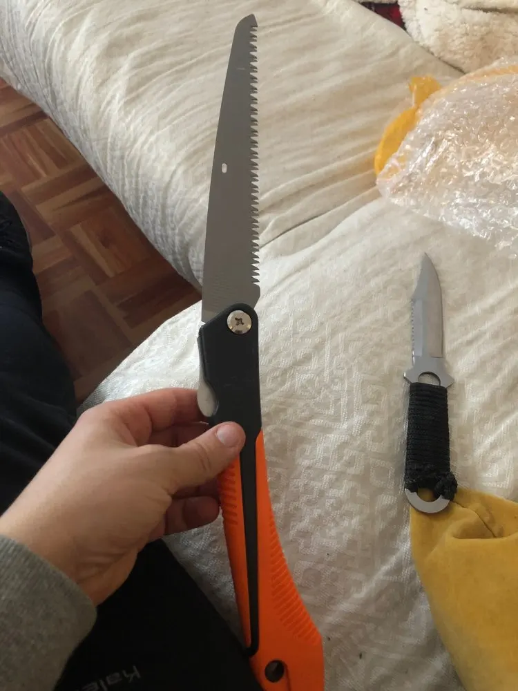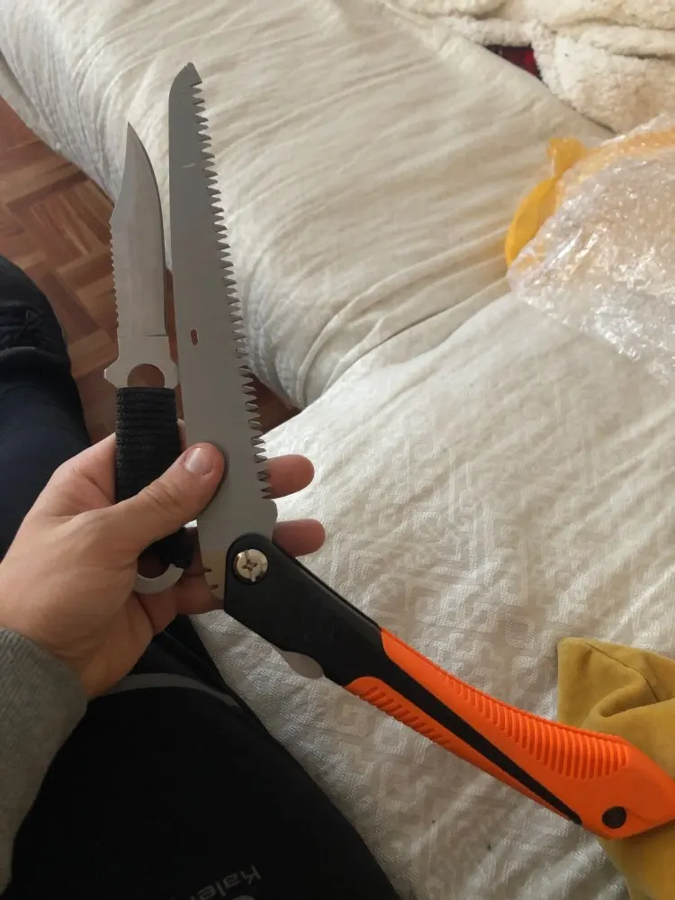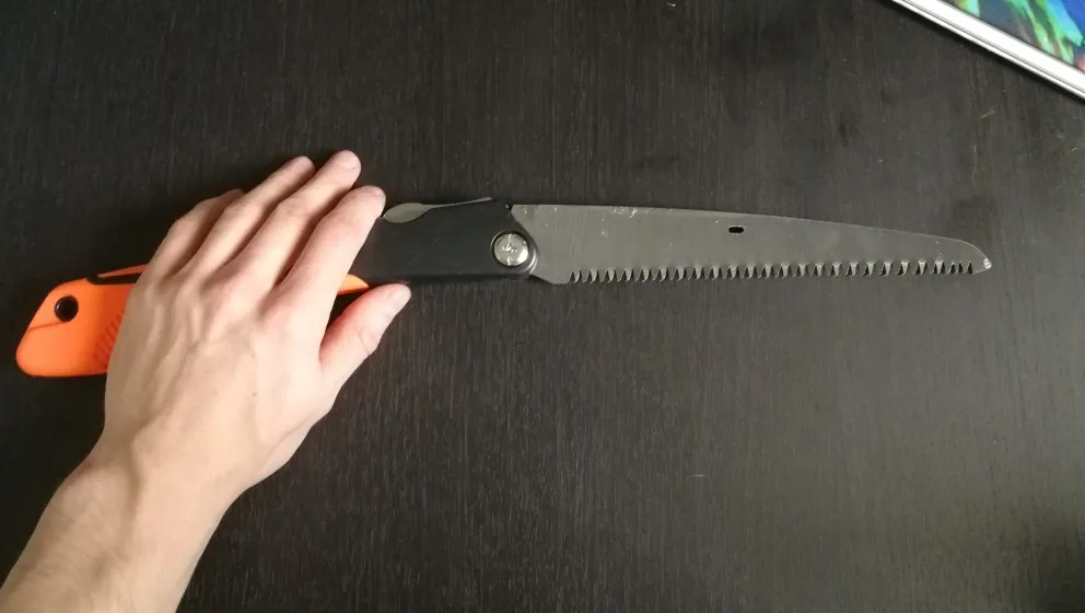 Заказывала ножовку среднего размера и угадала! Ни мала, ни велика. Ручка прорезиненная, держать удобно, не выскальзывает из рук. Вес тоже вполне себе, не сильно утяжелит рюкзак. Зубья разнонаправленные, острые. Пилить не пробовала, жду похода) Покупкой очень довольна. Продавец отправил товар очень быстро. Посылка пришла на Камчатку за 2 недели!!! Я, честно в шоке. Тогда как по России больше месяца не могу дождаться. Продавца и товар порекомендую.