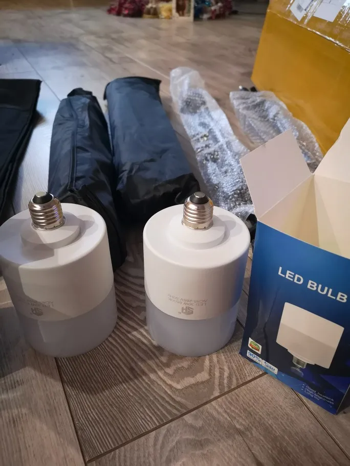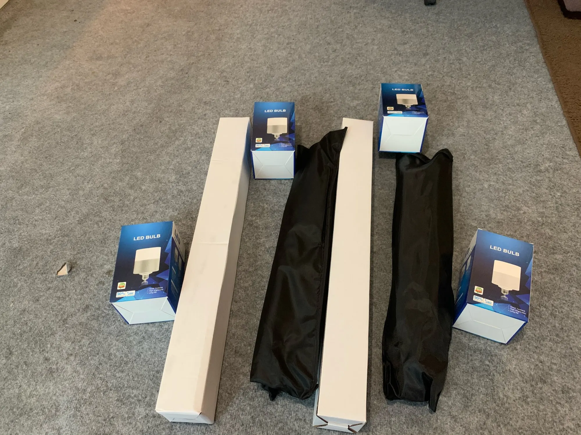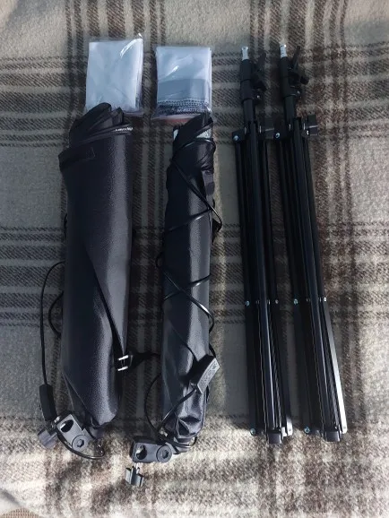 Заказ приехал быстро за 4-5 дней, доставили до квартиры. Собрали пока только один из двух штативов, включили, все работает. В комплекте 4 лампочки, 2 маленьких и 2 побольше. Ещё сумка переноска. Спасибо продавцу!