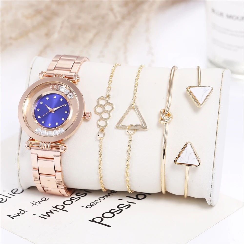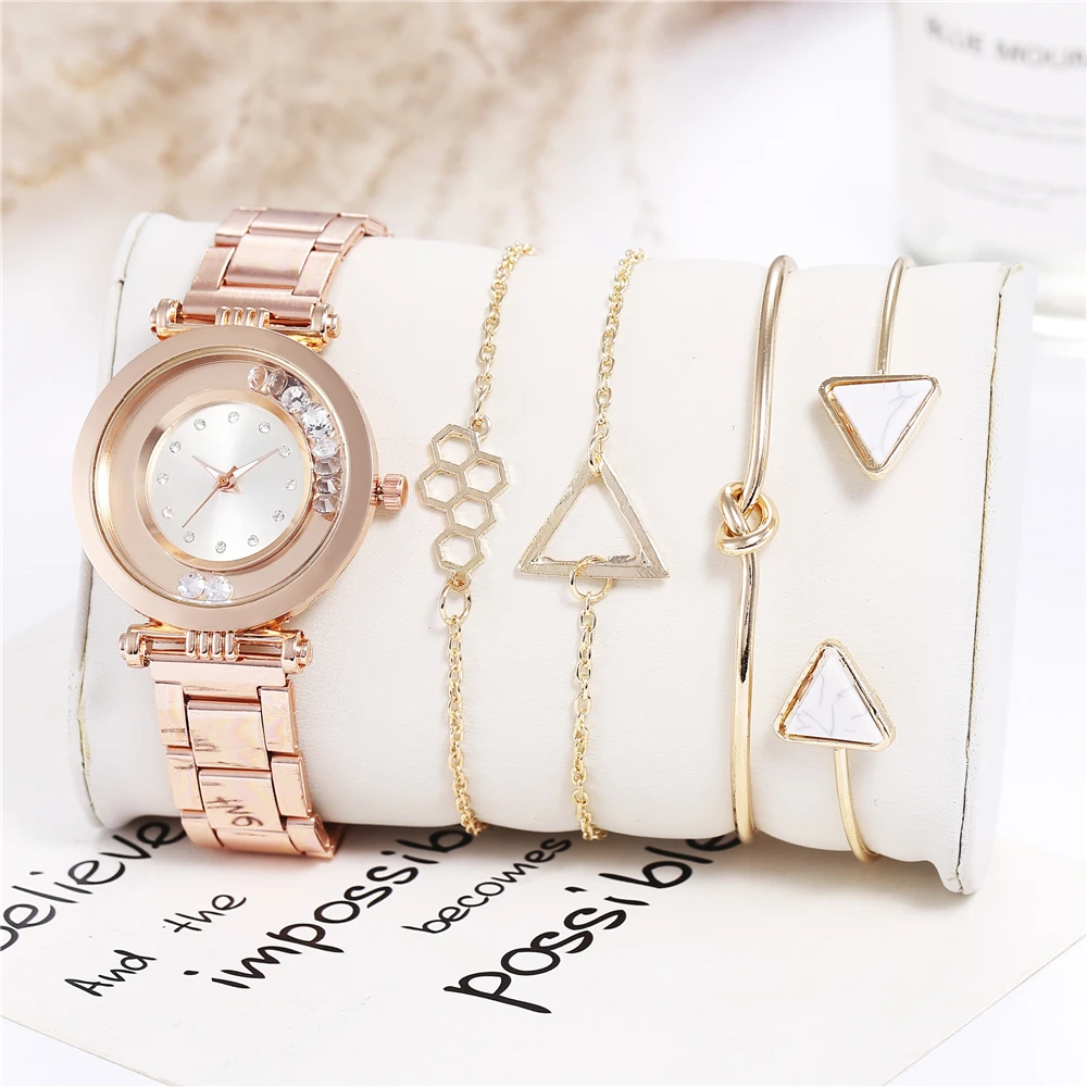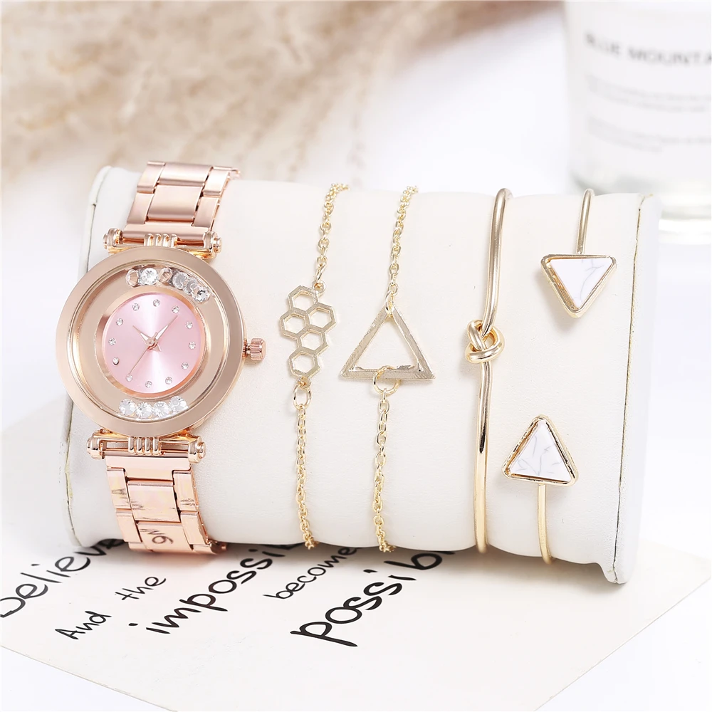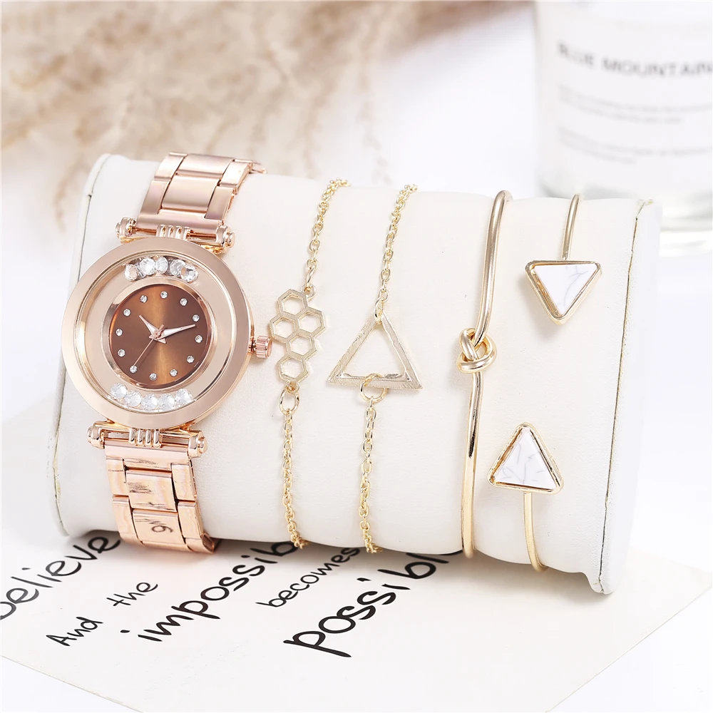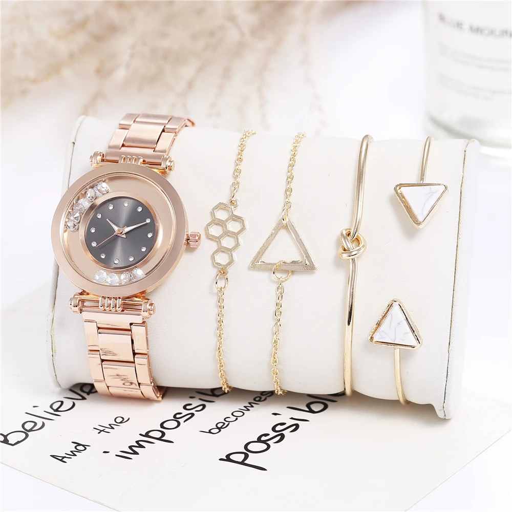 5 шт.компл. модные роскошные Брендовые женские часы с круглым кристаллом и браслетом, кварцевые наручные часы цвета розового золота, женские наручные часы, женские часы