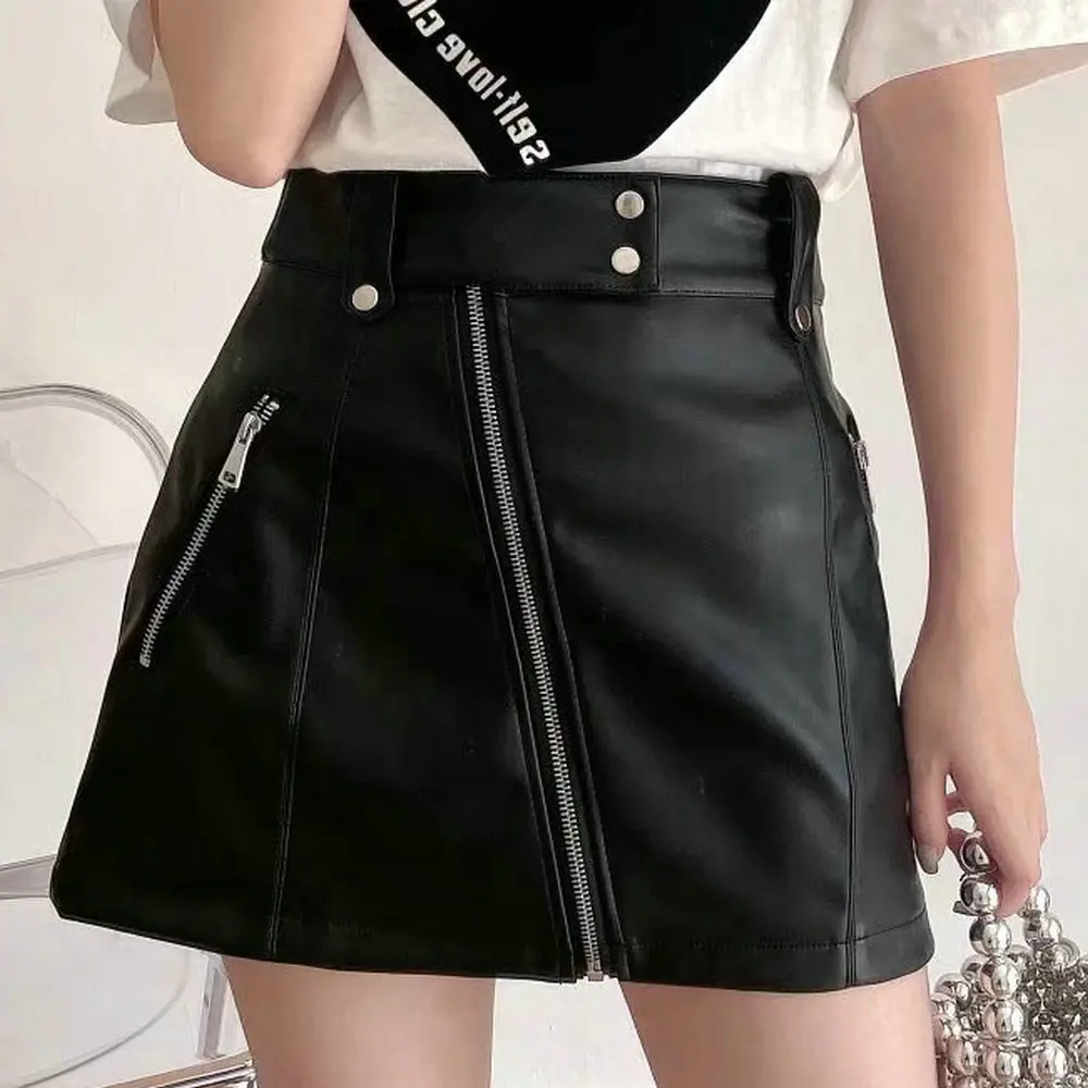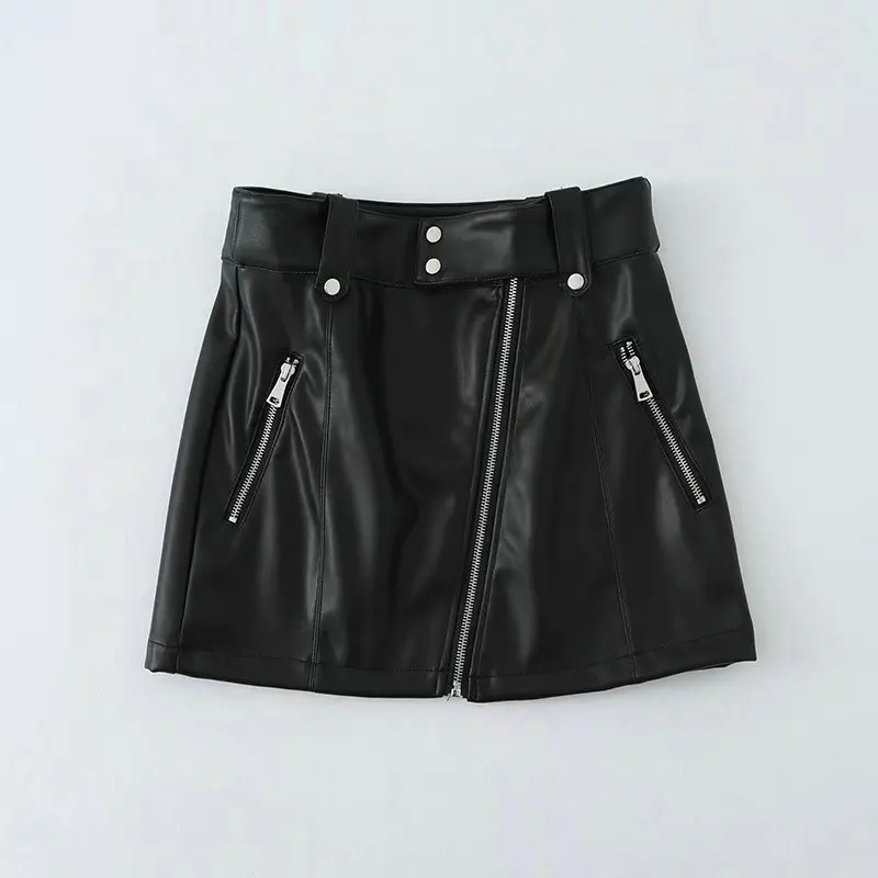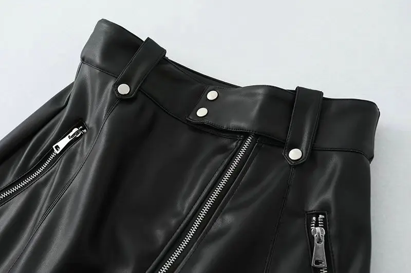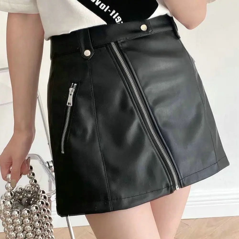 Женская мини-юбка из искусственной кожи, черная трапециевидная юбка на молнии с карманами и высокой талией, Осень-зима 2021