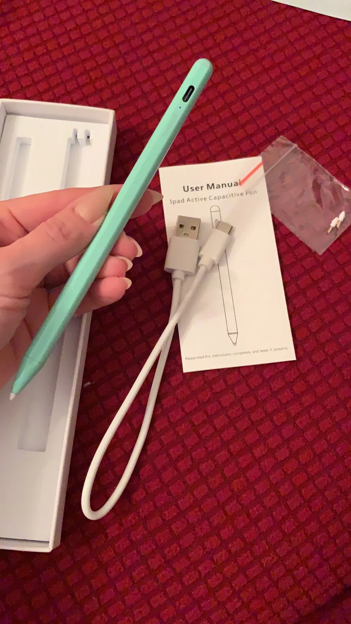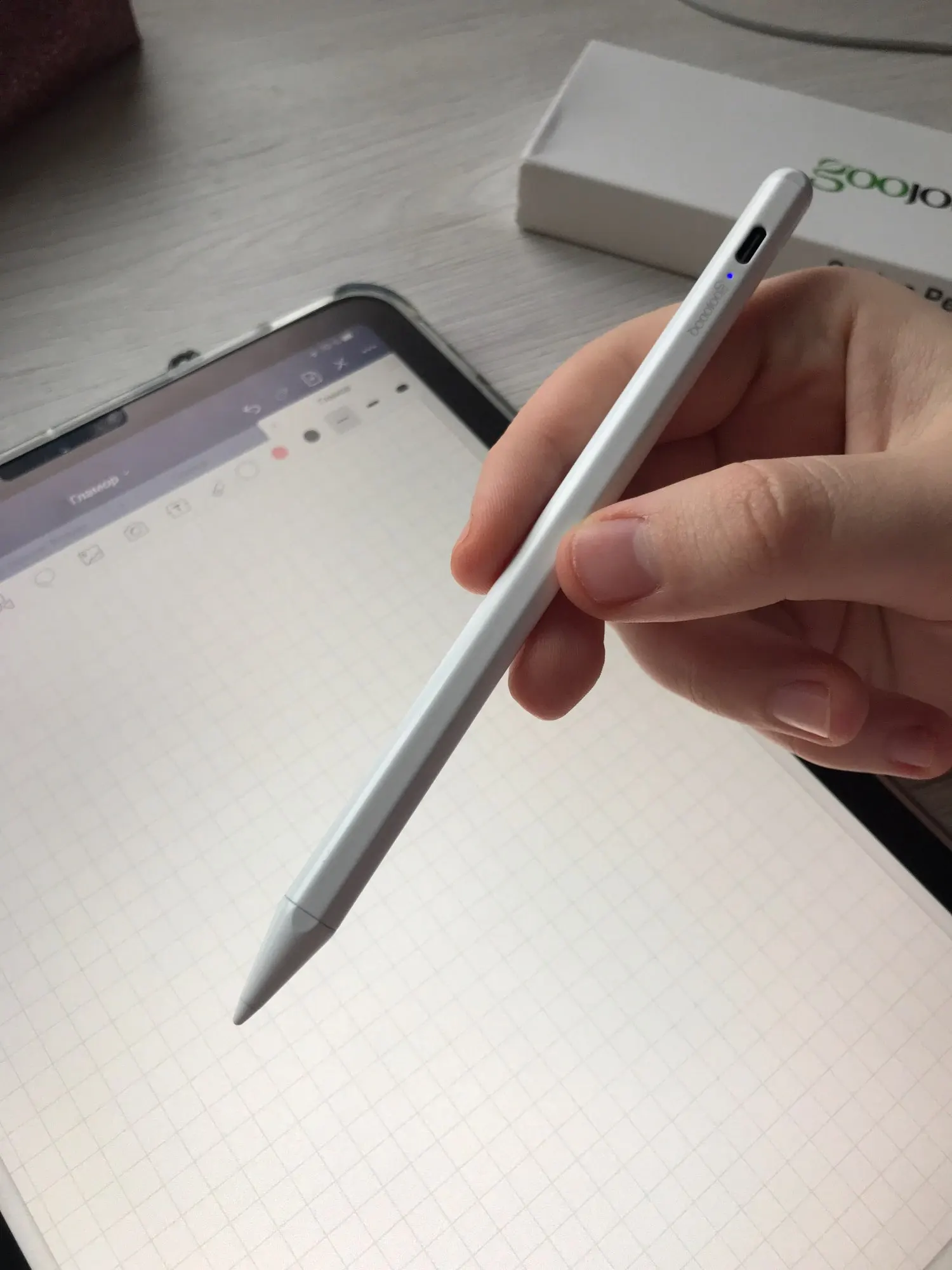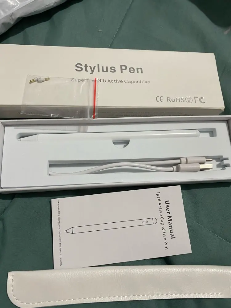 Стилус прекрасный: удобно лежит в руке, хорошо пишет. Из недочётов только слегка помятая коробка, но это скорее вина почты. В комплекте два запасных наконечника, чехол и зарядочка. С ipad air 4 работает отлично