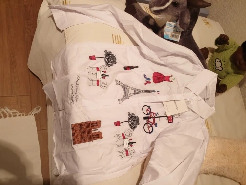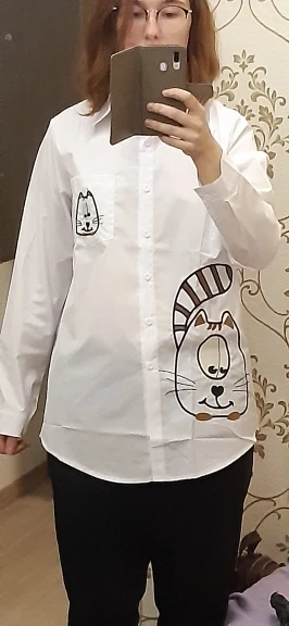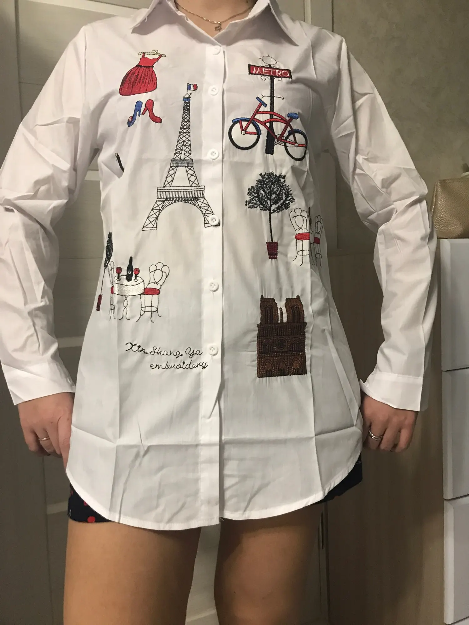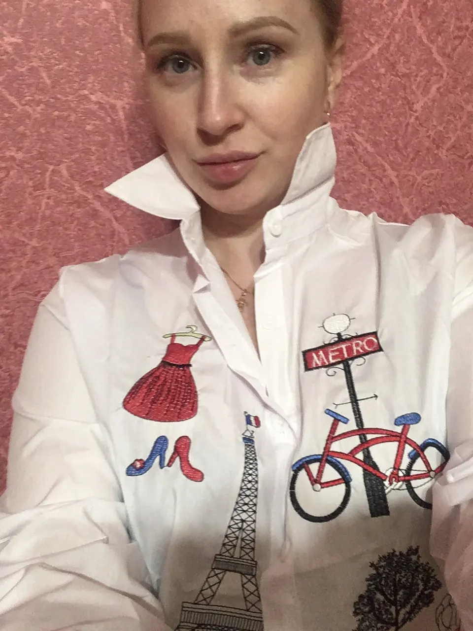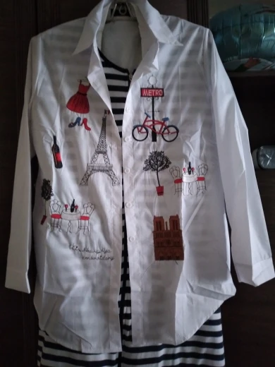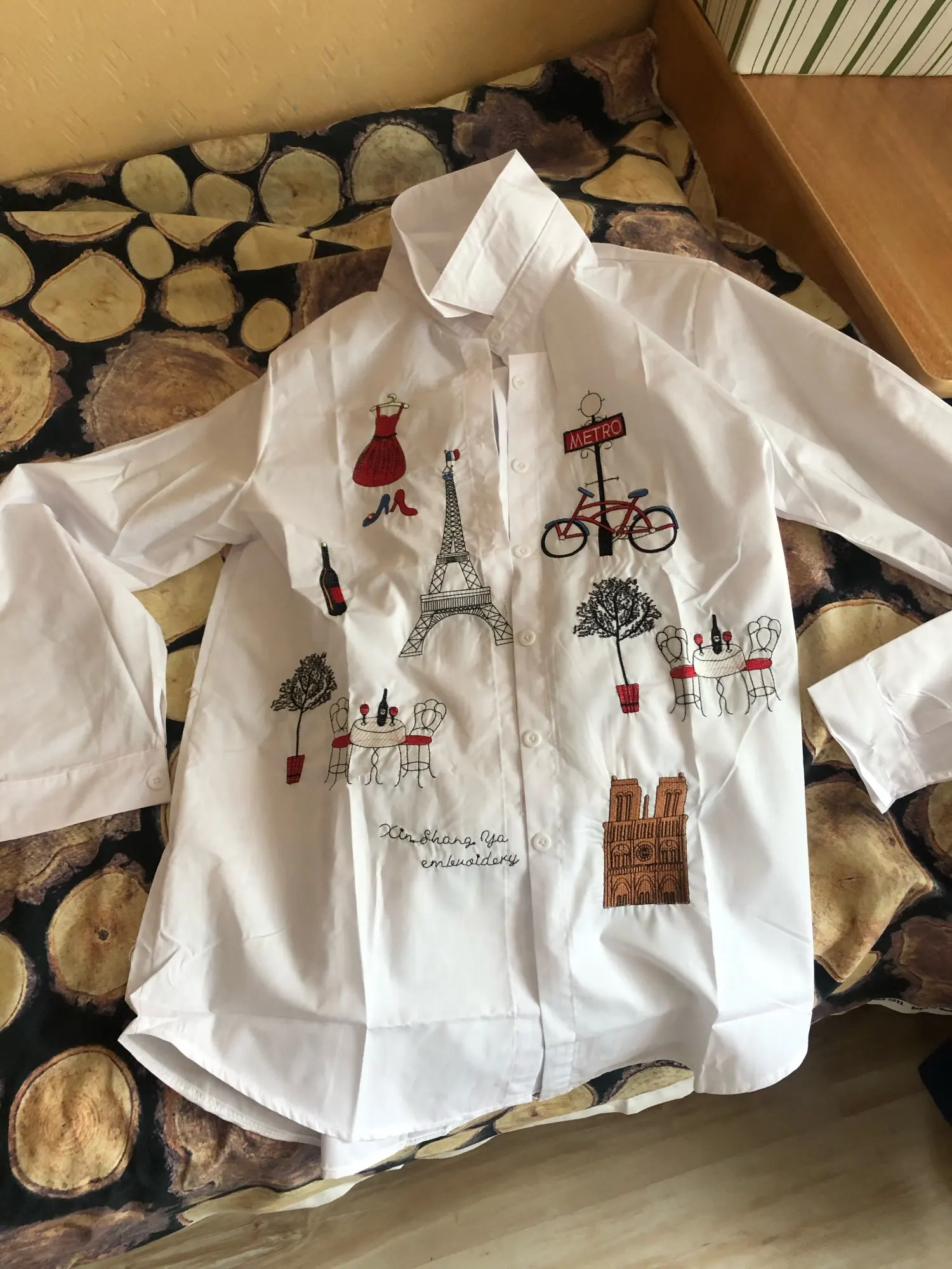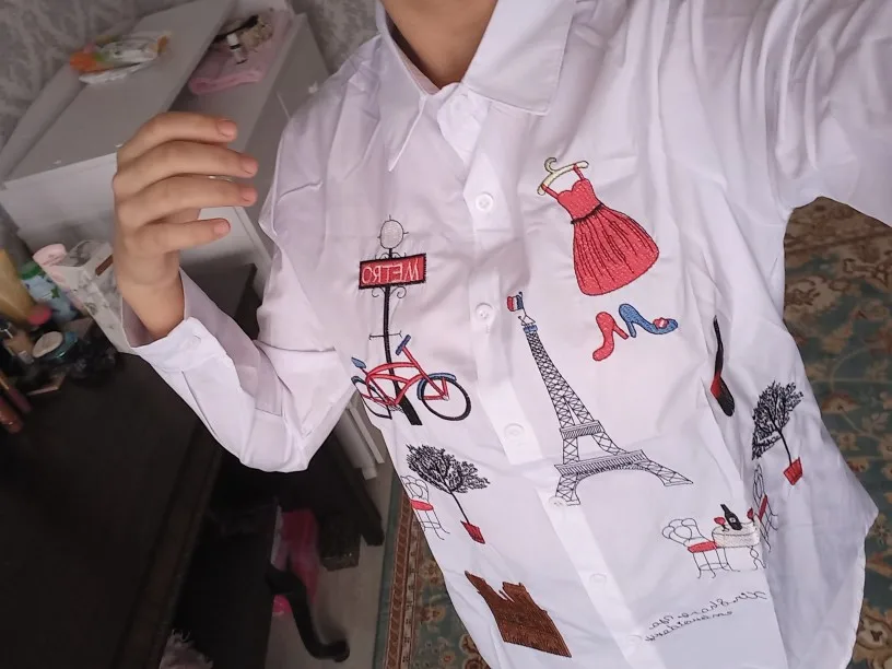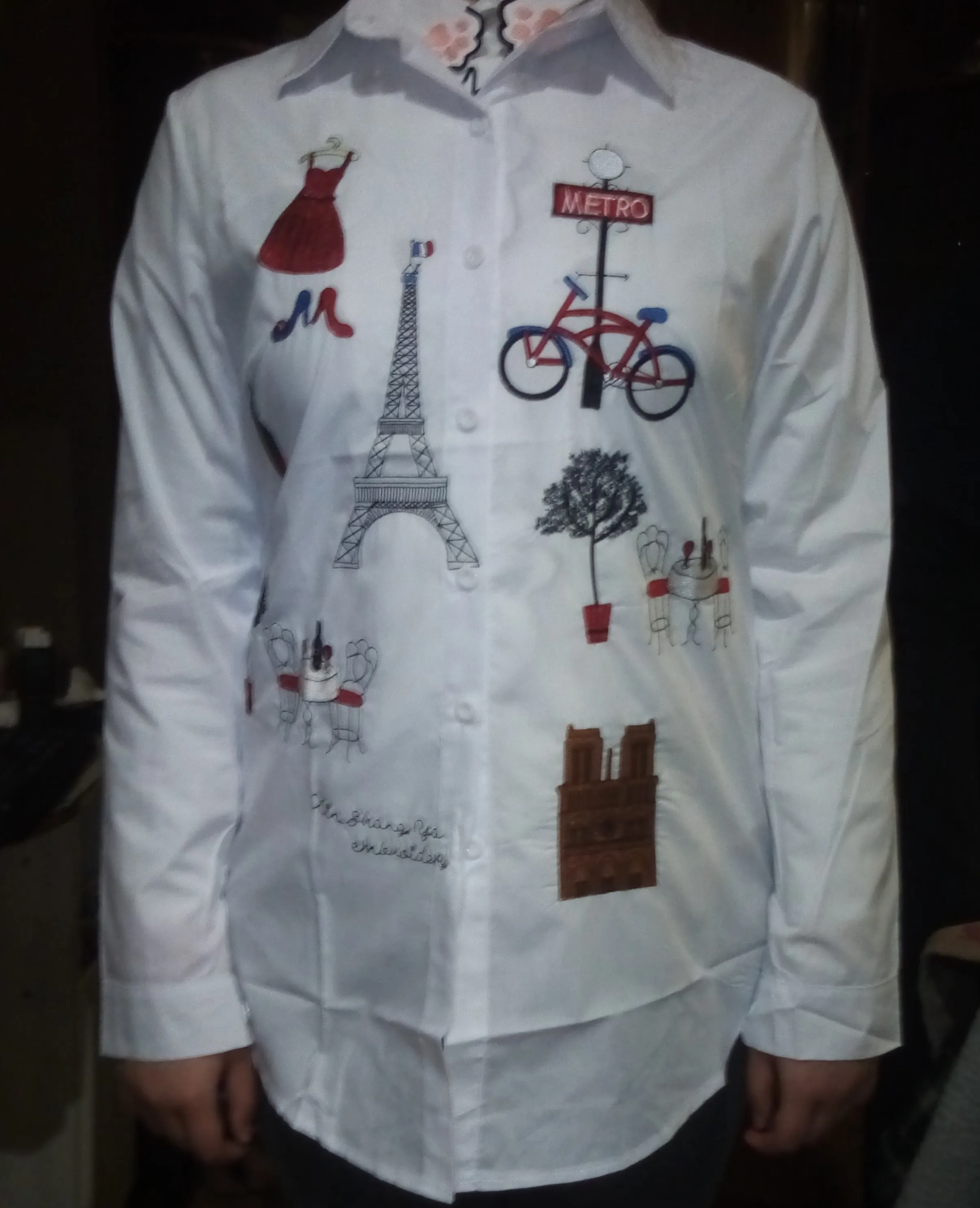 Рубашки отличные, но маломерят. Вышивка не стягивается, вышивка красивая, но на параметры 92-78-106 только-только по плечам. Мои плечи - 39-40 см, Оверсайза не получается. Боюсь, что стирка будет только ручная и в холодной воде, иначе боюсь что сядет на один размер точно. Котики смотрятся даже интереснее, чем Эйфелева башня