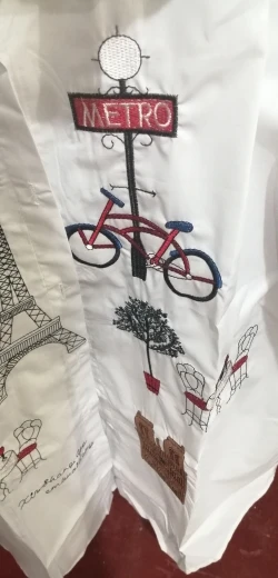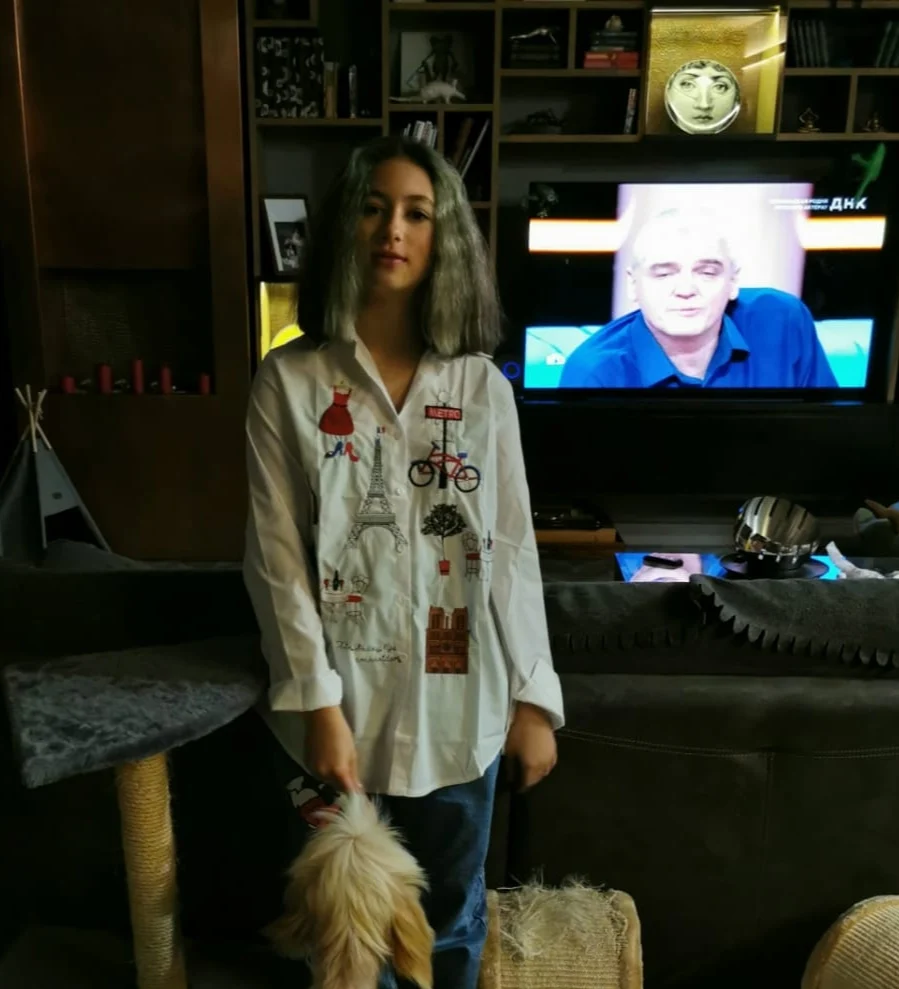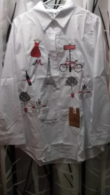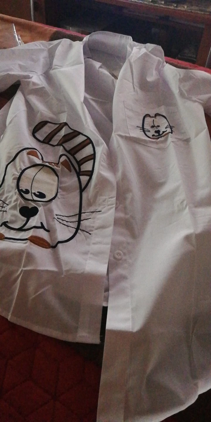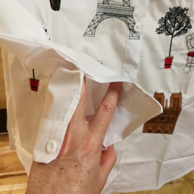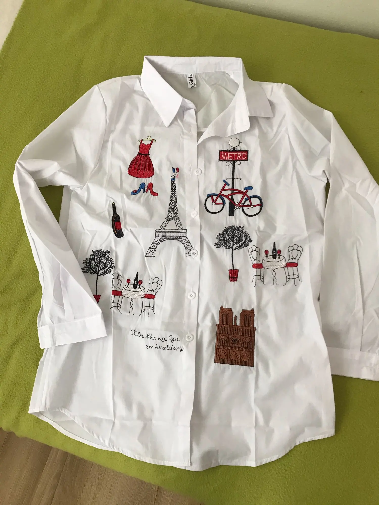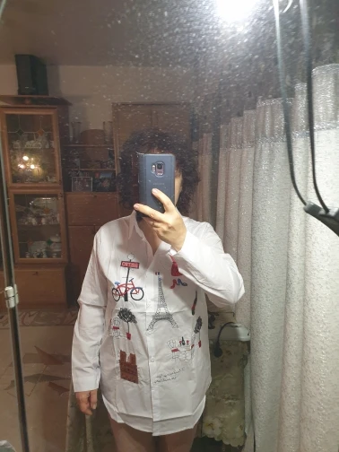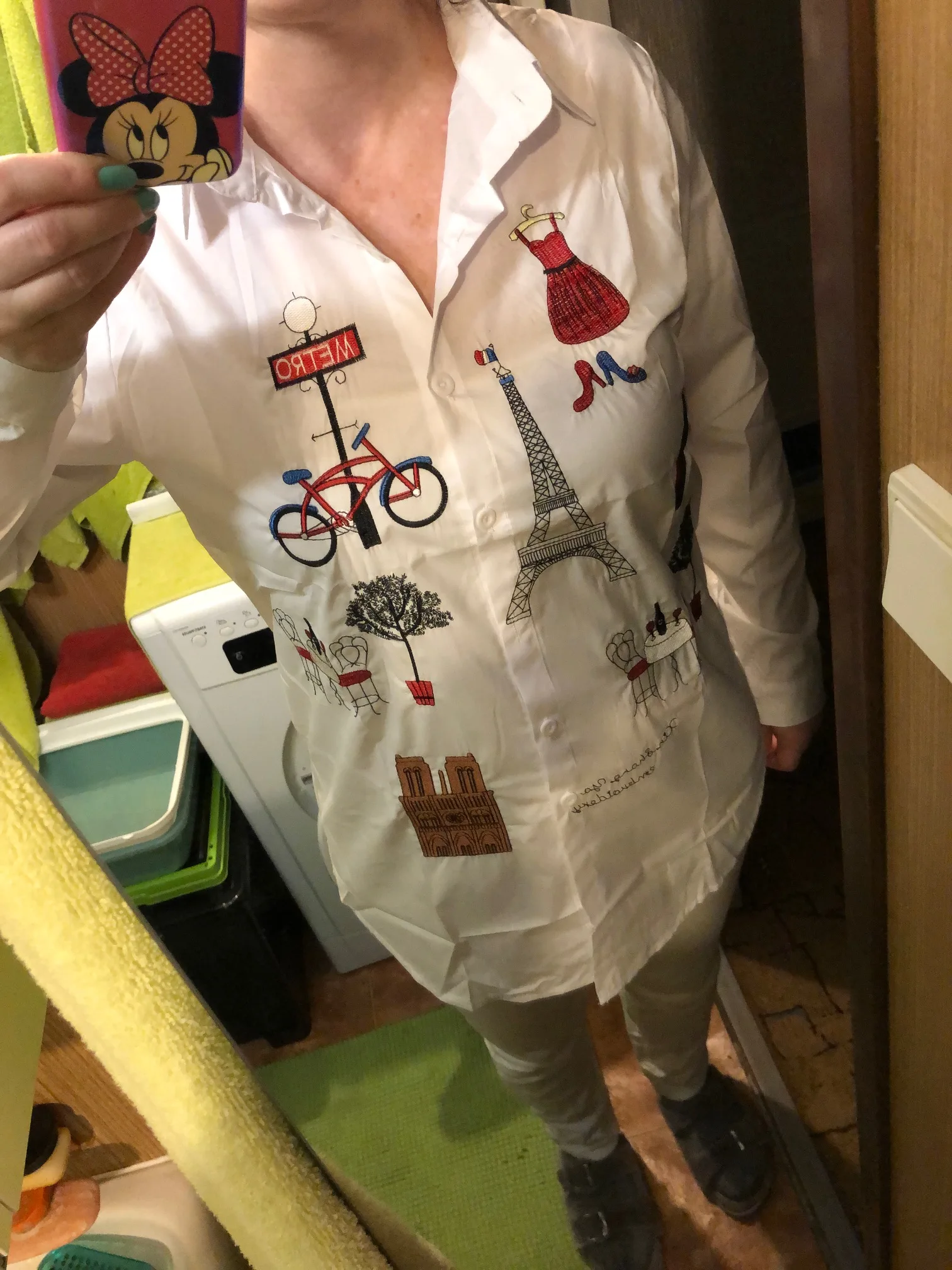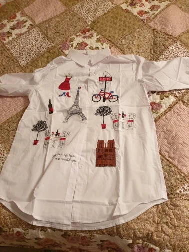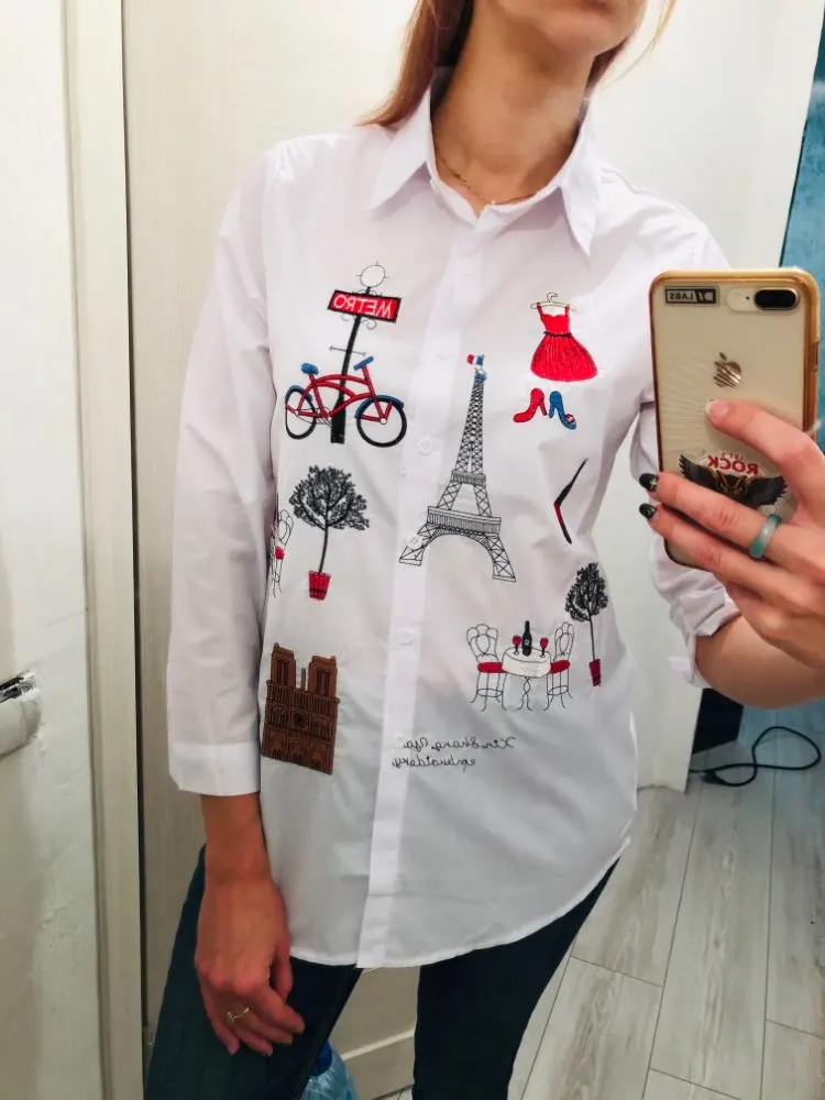 Рубашки отличные, но маломерят. Вышивка не стягивается, вышивка красивая, но на параметры 92-78-106 только-только по плечам. Мои плечи - 39-40 см, Оверсайза не получается. Боюсь, что стирка будет только ручная и в холодной воде, иначе боюсь что сядет на один размер точно. Котики смотрятся даже интереснее, чем Эйфелева башня