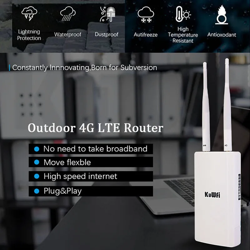 Уличный wifi роутер KuWFi 4g,роутер wi fi с сим картой 4g слотом для , 150 Мбитс CAT4,Внешний усилитель Wi-Fi сигнала для любой погоды, удлинитель для IP-камер