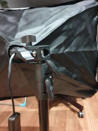 Неплохой софтбокс. Цоколь стандартный e27. Штатив металлический. Но немного люфтит. Можно было бы сделать из более толстого металла.