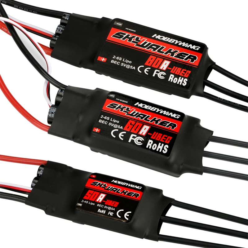 12A: Continuous current 12A, short-time current 15A (less than 10 seconds) Power input: two lithium batteries or 5-6 NiMH / NiCd battery pack BEC Output: 5V @ 2A (linear regulator mode -linear mode) Throttle signal frequency range (Refresh rate): 50Hz-432Hz Maximum speed: 2-pole motor 210000 rev / min, 6-pole motor 70,000 rev / min, 12 pole motor 35,000 rev / min Size: 38mm (length) * 18mm (width) * 6mm (H) Weight: 9g 15A: Constant current: 15A Peak current (10s): 20A BEC: 5V 2A Lipo: 2-3S Net Weight: 14g 20A: Model: Skywalker-20A Continuous Current: 20A Burst Current (>10s): 25A BEC Mode: Linear BEC Output: 5V2A BEC Output Capability: 5 Servos (2S Lipo) / 4 Servos (3S Lipo) Battery Cell: 2-3S (Lipo) / 5-9 cells (NiMH) Net Weight: 19g Dimension (L x W x H): 42 x 25 x 8mm Cable length: 25cm Package size: 12.5 * 11 * 2.5cm 30A: Constant Current: 30A Peak Current:40A(10s) Voltage: 2-3S lixx BEC: Yes BEC Output: 5V/2A Color: black Programmable:Yes Size: 70*25*8mm (not including cable length) Net Weight:38g 40A: Model: Skywalker-40A Continuous Current: 40A Burst Current (>10s): 55A BEC Mode: Linear BEC Output: 5V2A BEC Output Capability: 5 Servos (2S Lipo) / 4 Servos (3S Lipo) Battery Cell: 2-3S (Lipo) / 5-9 cells (NiMH) Net Weight: 35g Dimension (L x W x H): 68 x 25 x 8mm 50A: COntinuous output: 50A Burst current: 60A@10S Power input: 2-4S Lixx/5-12S Nixx 5V/3A BEC output, switch mode Refresh rate: 50Hz-432Hz Max.rotation speed: 2-Pole 210000rpm/min; 6-Pole 70000rpm/min; 12-Pole 35000rpm/min Dimension: 68*25*12mm Weight: 43g 60A: Item Name: Hobbywing SkyWalker 60A UBEC ESC Constant Current: 60A Burst Current (>10s): 80A BEC Mode: switch mode BEC Output: 5V at 3A Battery Cell: 2-6 cells Lipo,or 5-18 cells NiHH Refresh Rate: 50Hz-432Hz Dimension: 77 x 35 x 14 mm Weight: 63g Maximum speed: 210000 RPM (2 poles motor), 70000 RPM (6 poles motor), 35000 RPM (12 poles motor) 80A: Item Name: SkyWalker 80A UBEC Type: Brushless ESC,Regular voltage Cont./Peak Current: 80A/100A Input: 2-6S LiPo,5-18s Ni-MH BEC Output: Switch Mode--5V,5A Input Wires: Red-12AWG-150mm*1,Black-12AWG-150mm*1 Output Wires: Black-14AWG-100mm*3 Input Connectors: NO Output Connectors: NO ESC Programing via: Transmitter,LED Program Card,Program Port (Program/Throttle Wire) Firmware Upgrade: Not Supported Size: 86.0x38.0x12.0mm Weight: 82g