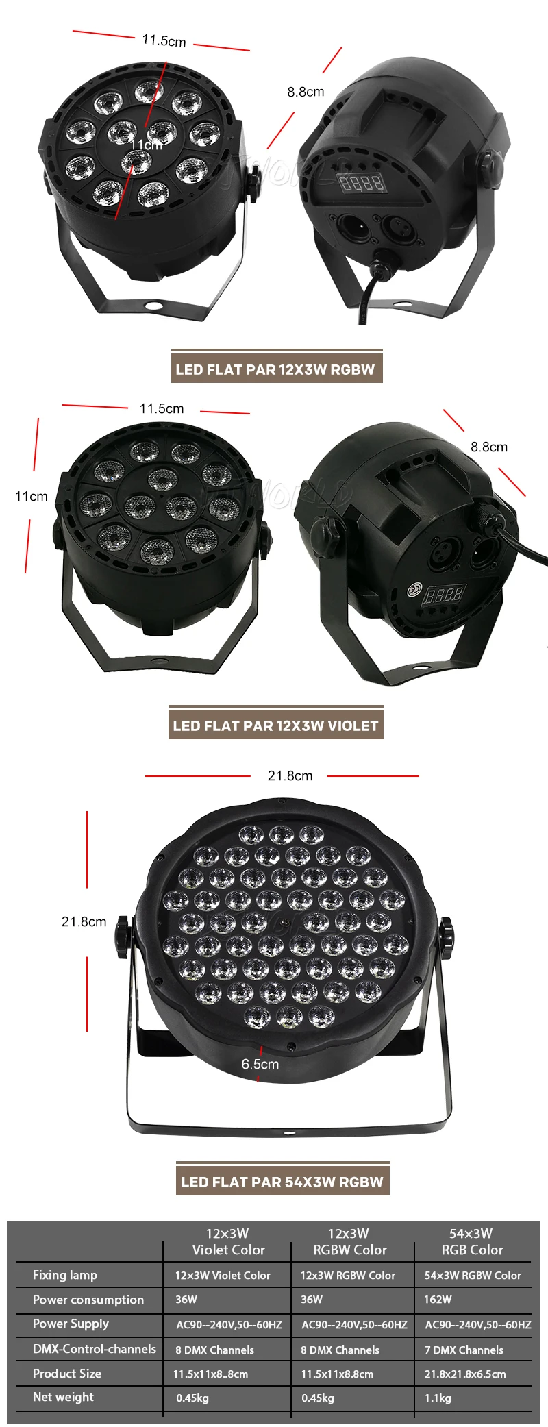 * Источник питания: AC90--275V,50 -- 60 Гц* Потребляемая мощность: 36 Вт* Крепежная лампа: LED 12 × 3 Вт фиолетового цвета* DMX-Каналы управления: 8 каналов DMX* Челнок: частота вспышки: 0-10 Гц* Диммер: механический Диммер 0-100%* Светодиоды с длительным сроком службы (более 60000 часов)* Размер продукта: 11,8 × 10,5 × 11,4 см* Вес продукта: 0,35 кг* Размер посылка: 13 × 13 × 14 см* Посылка: 0,45 кг