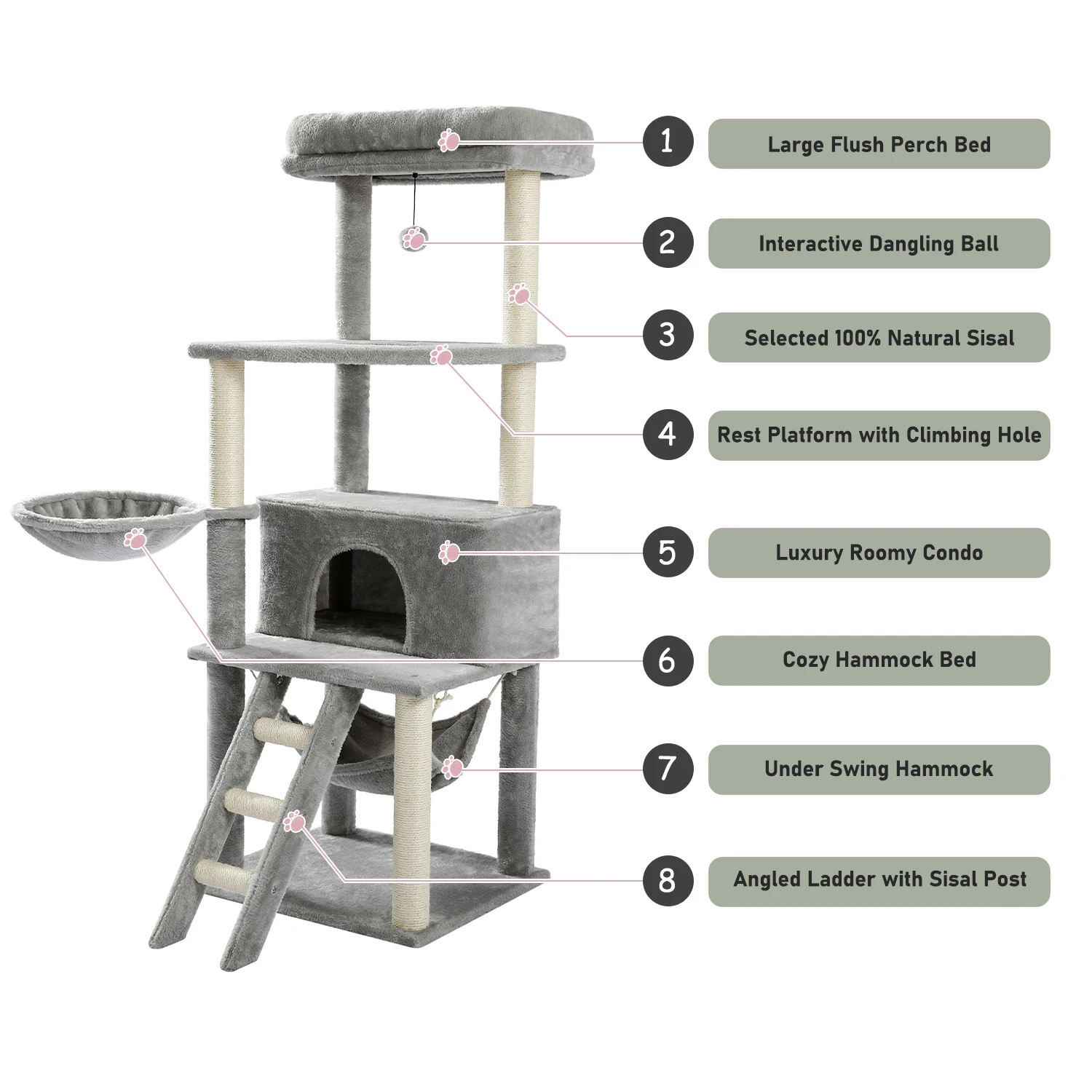 Очень быстрая доставка по Франции. Кошка легко собрать с помощью плана и пронумерованных деталей. Один из самых дешевых сайтов с учетом стоимости доставки для довольно большого кошачьего дерева и не занимает много места, очень практично