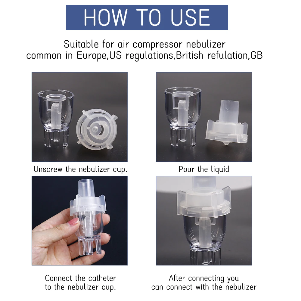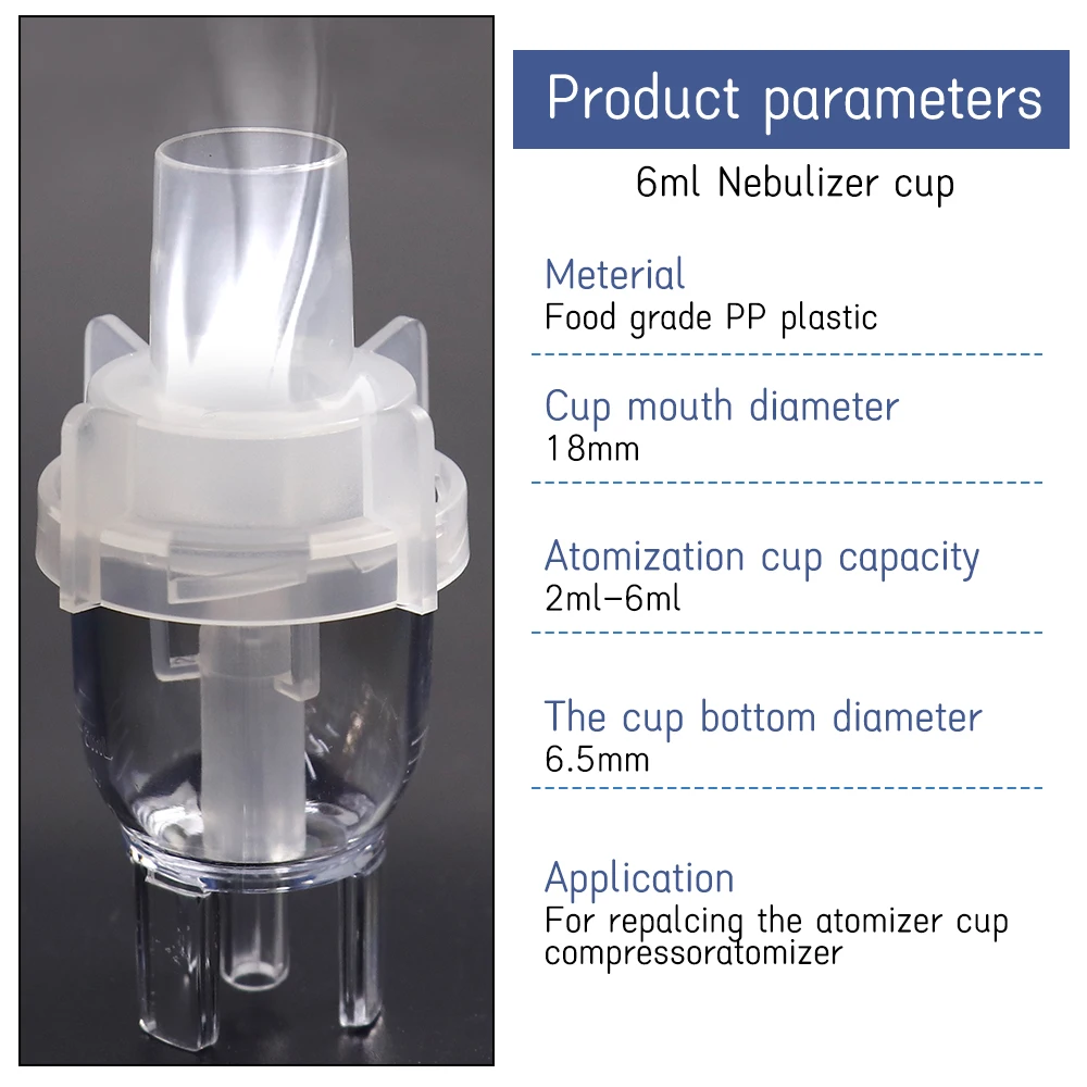 Подходит для воздушного компрессора небулайзера, использование гидравлического может образовывать распыление частиц 5 микрон, распространенное в Европе, США, британские правила, GB. Чашки небулайзера обычно используются для поставок из нетоксичного PP материала (полипропиленовый материал обычно используется для изготовления коробок, чашек, медицинских принадлежностей и т. д.), мы рекомендуем одну чашку, не может использоваться взаимозаменяемо, чтобы избежать вторичных инфекций! Повторное использование не рекомендуется, чтобы избежать возникновения старения жидкого материала и фармацевтического ответа. Упаковочный лист: компрессор небулайзер чашка * 1