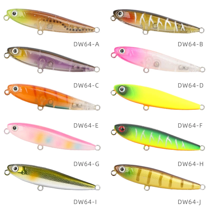 Задняя система передачи веса для увеличения дальности заброса, Летальное сочетание действия и динамической акустики, карандаш DW64 позволяет любому рыбаку без усилий выполнить идеальное действие «walk-the-dog», сопровождаемое уникальной акустической погремушкой. Чтобы привлечь внимание игровой рыбы, карандаш DW64 также оснащен четкими красными глазами, которые придают ему вид поврежденной рыбы. Информация об изделии: 1. Имя: DW64 2. Вес: 3,1 г 3. Длина: 60 мм 4. Цвет: A B C D E F H I J 5. Тип: плавающий карандаш 6. Глубокая: верхняя вода 7. Крючки: 2 крючка 8 посылка: 1 шт.