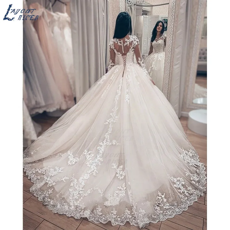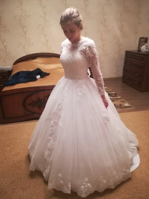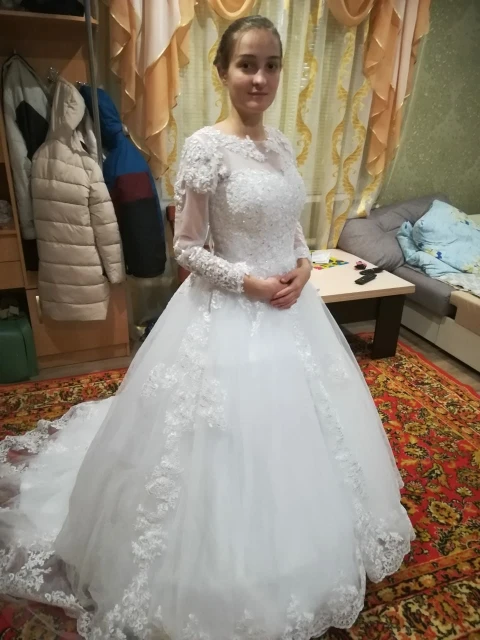 Платье свадебное с длинными рукавами, кружевной аппликацией и шлейфом, 2020