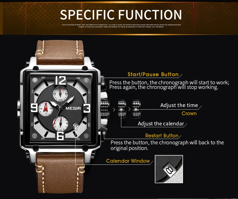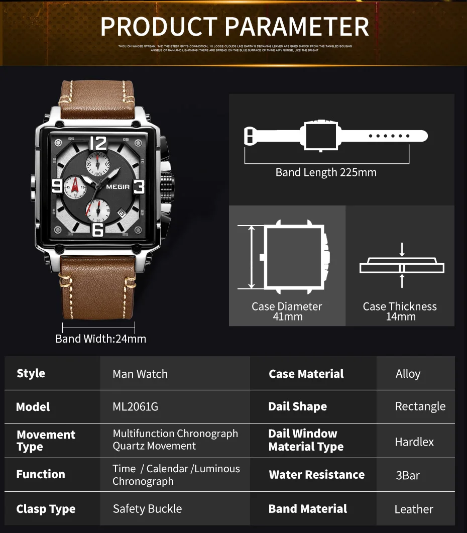 Модель: MEGIR 2061 Механизм: кварцевый механизм Пол: мужские и мужские Стиль: деловой, модный и роскошный Тип материала окна набора: Hardlex Тип материала ремешка: кожа Тип застежки: Пряжка Толщина чехла: 14 мм Диаметр циферблата: 41 мм Длина ремешка: 225 мм Ширина ремешка: 24 мм Особенность: время, хронограф, водостойкость 30 м, отображение даты, светящиеся стрелки.