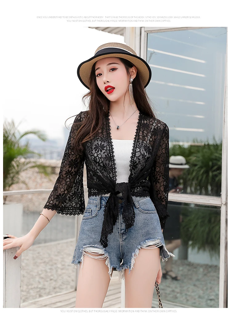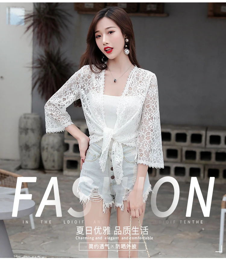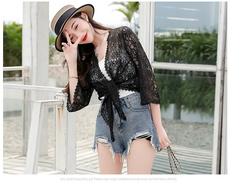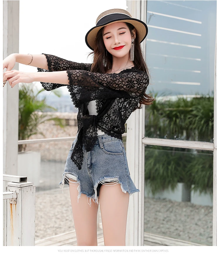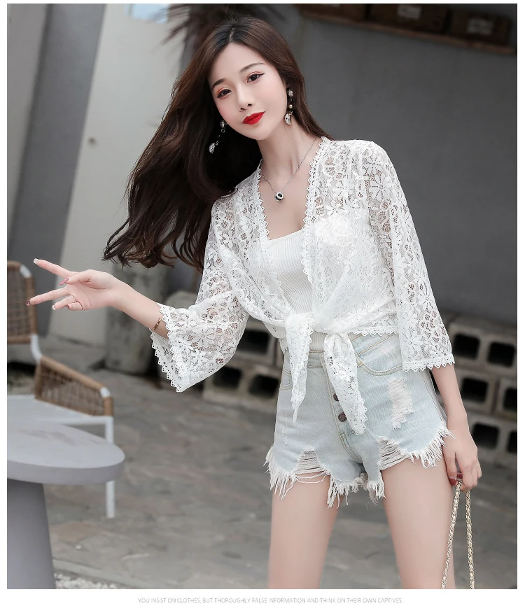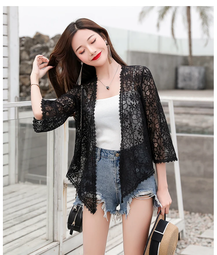 Кардиган женский пляжный с кружевом, пикантная Свободная блузка, повседневный ажурный топ, пляжная одежда, белый и черный цвета, лето 2021