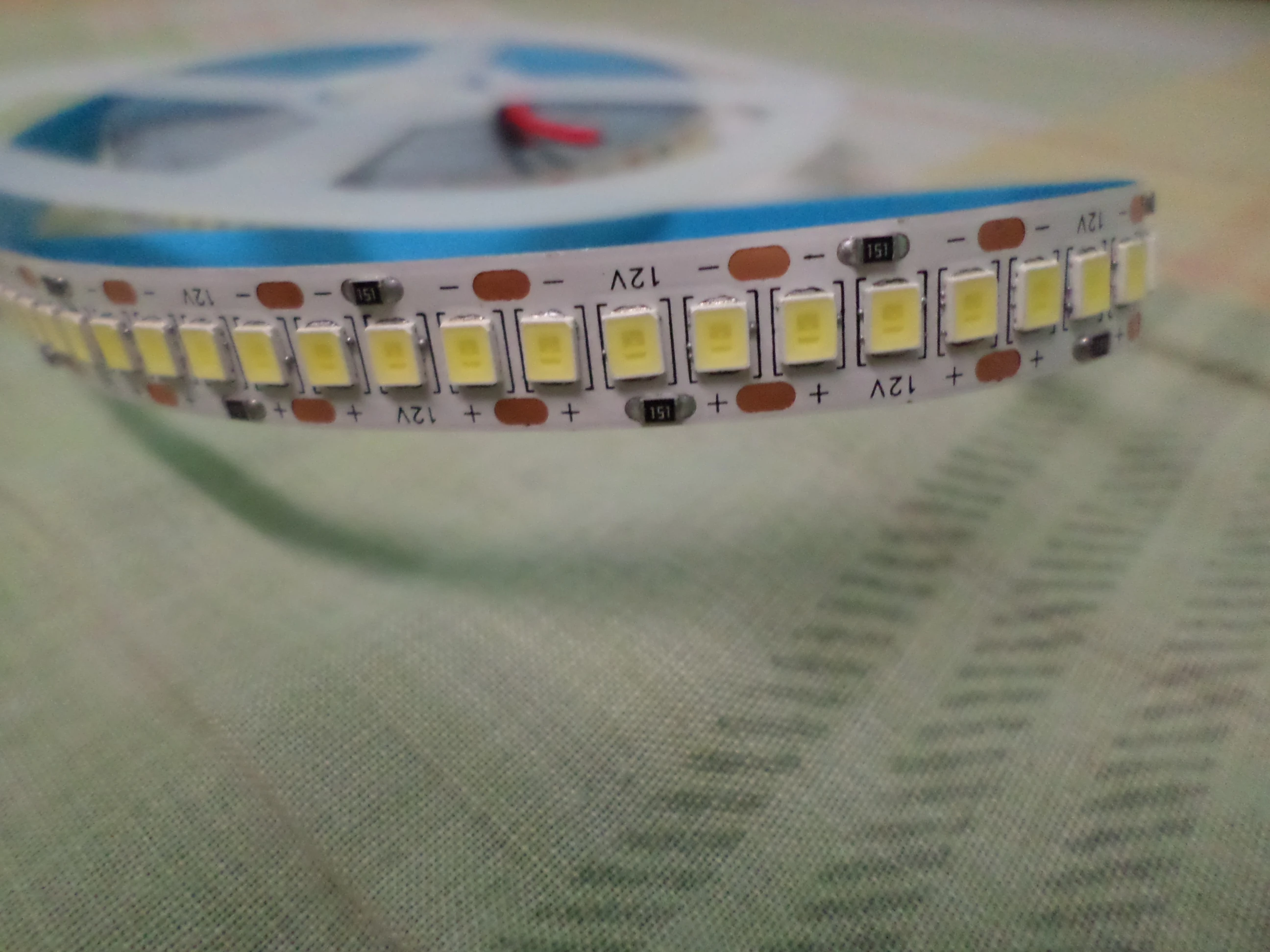 лента 480 светиков/м шпарит - глаза выжигает... глазом свет сливается между отдельными диодами, даже без рассеивателя , хотя различить отдельные диоды можно.. но больно)) на камеру просто полоса(фоткал днем-пасмурно у окна) при напряжении 11.65В полметра(лента спаяна из кусков по 0,5м) потребляют ток 1,2А не всякий БП на 10А вывезет 5м ленты.. если опустить световой поток, то свет приятный... теплый белый не сильно желтит... немного более теплый чем натуральный белый.. греется на тех самых 11.65В, как печка. без массивного профиля-радиатора долго не проживет... первый раз включил в мотке.. за 30сек ощутимо нагрелась.. брал для установки в профиля для создания декоративного света... напряжение буду уменьшать ни света ни тепла мне столько не нужно.
