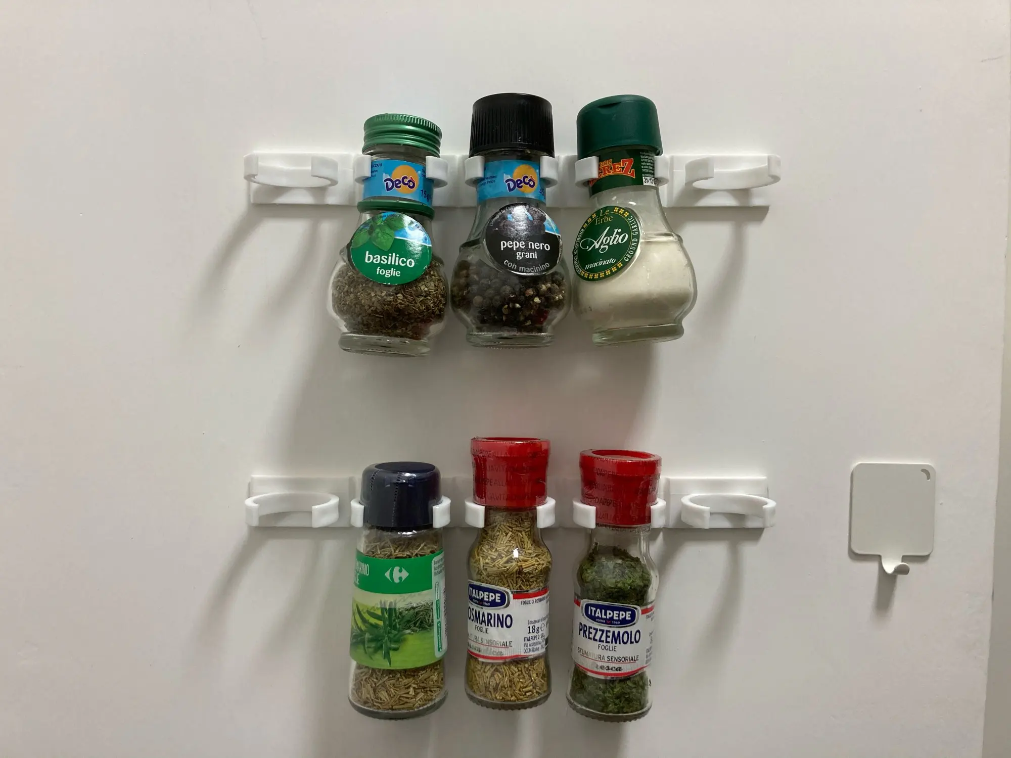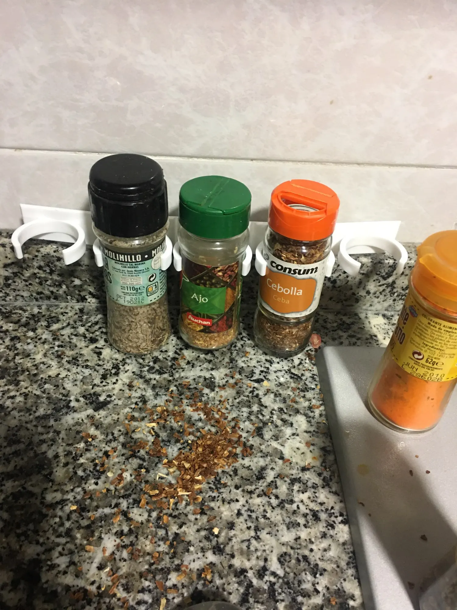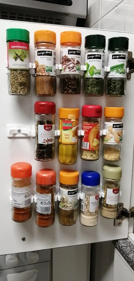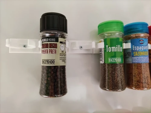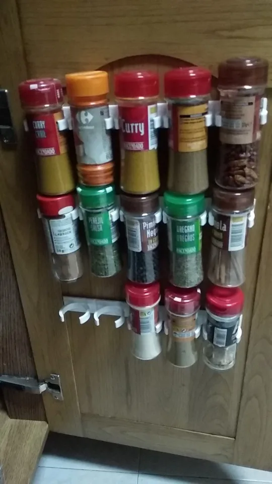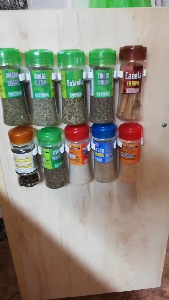 Encaja bien con los tamaños normales de los botes de especias. Me gustó que puedes colocar toda la tira entera o cortarlo en trozos para colgarlos de forma individual, lo he hecho así para aprovechar más el espacio pero al día siguiente se me han despegado todos, voy a buscar otra forma de pegarlo ya que el plástico que engancha el bote no se han roto, pero no sé si aguantará... no es por el peso porque son de plástico, no de cristal.
