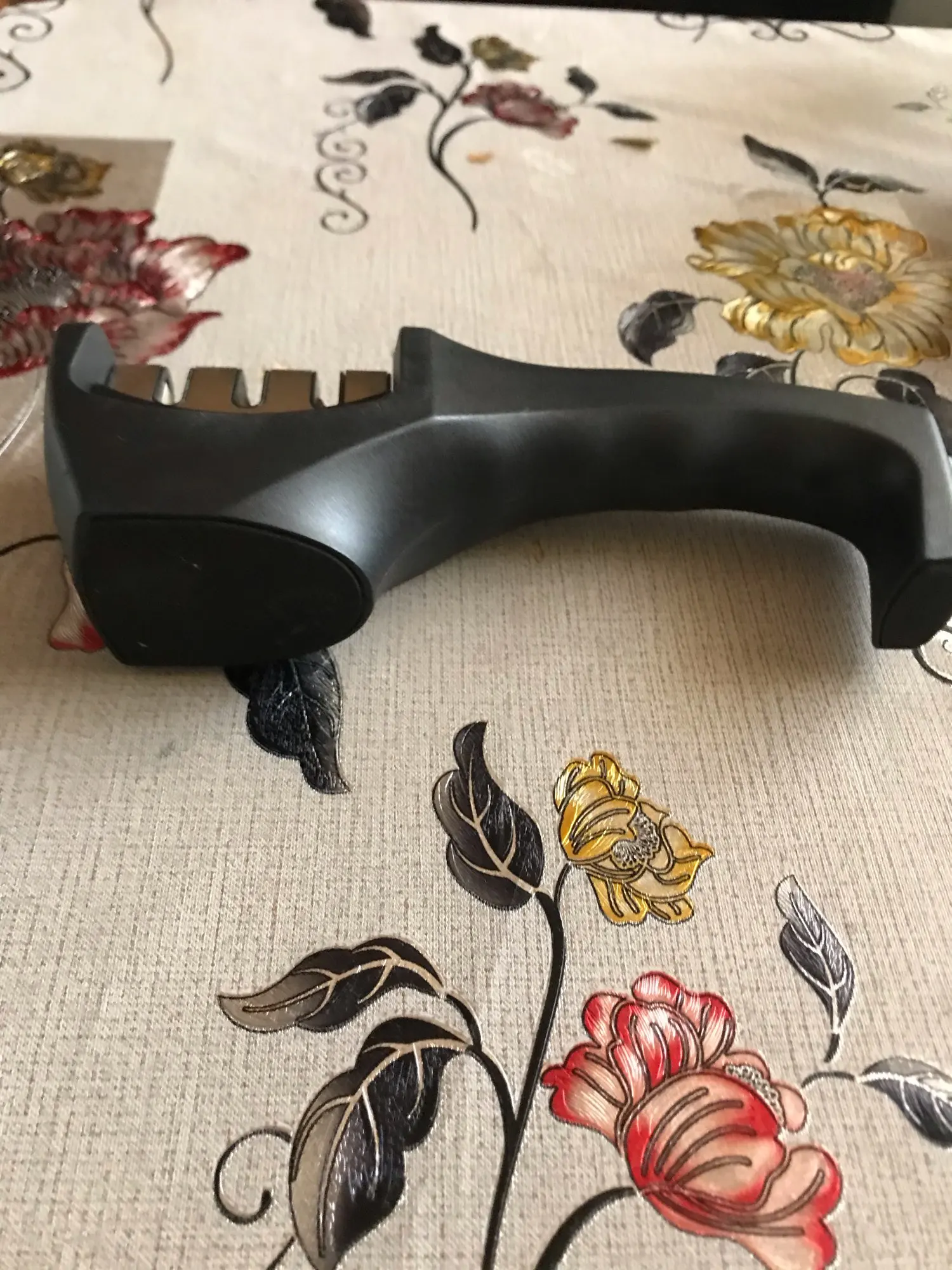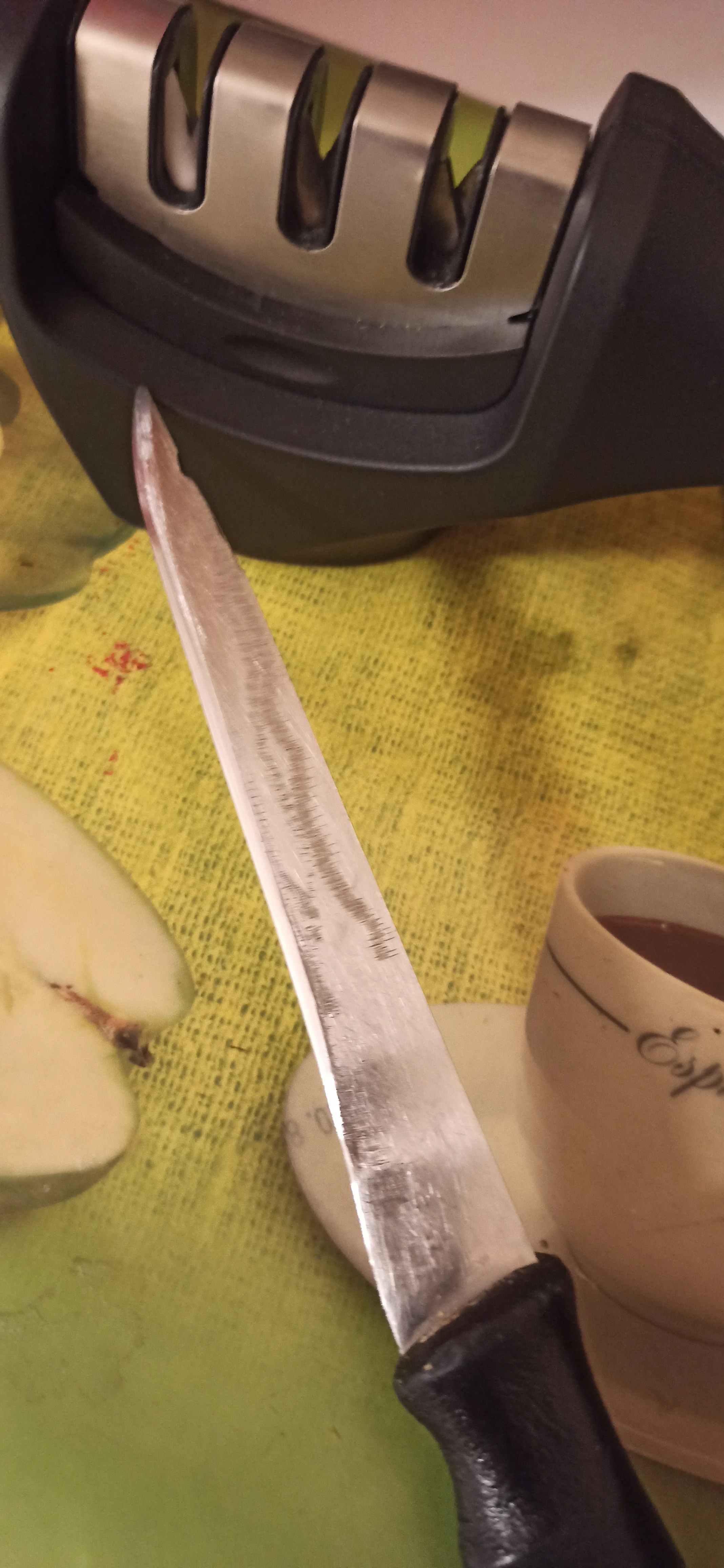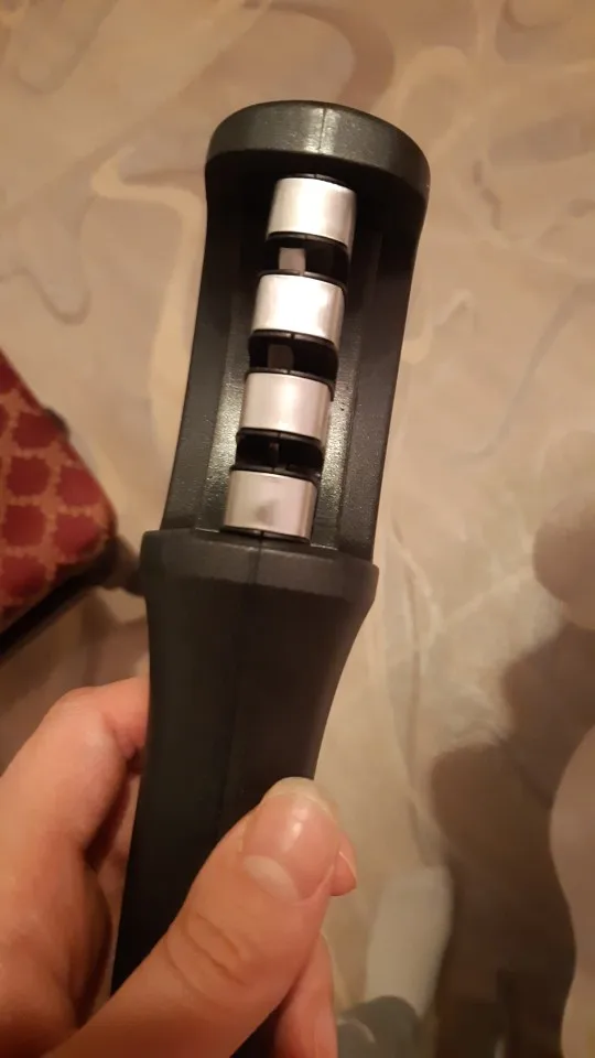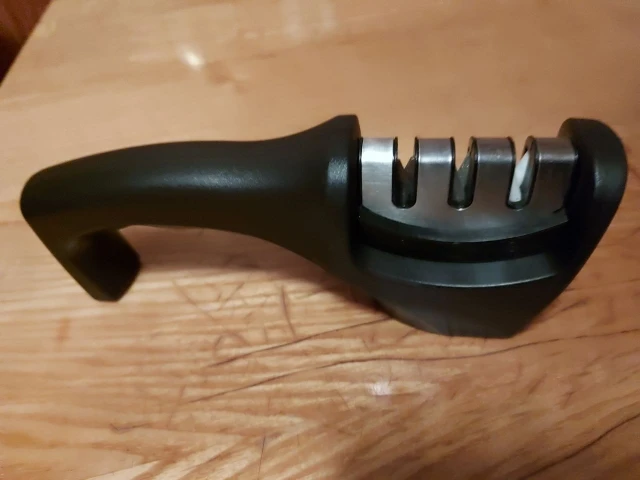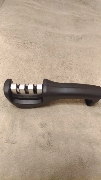 очень как рекоммендую к покупке!!!отлично точит...все 3 отсека разного уровня...даже на первой отлично точит...до 2 и 3 даже не дохожу так как сильно остро опасно.. тем более дети...в руке очень удобно держать..сам по себе легкий и есть возможность повесить куда-'нить...до этого страдала с ножеточкой старая была...с этой за 15 сек можно наточить нож!!!